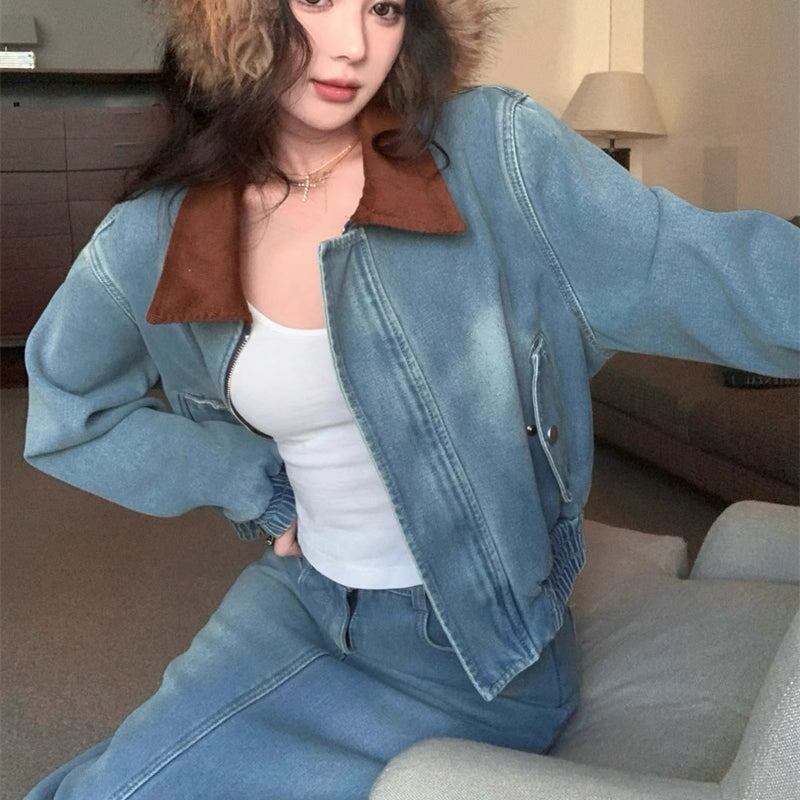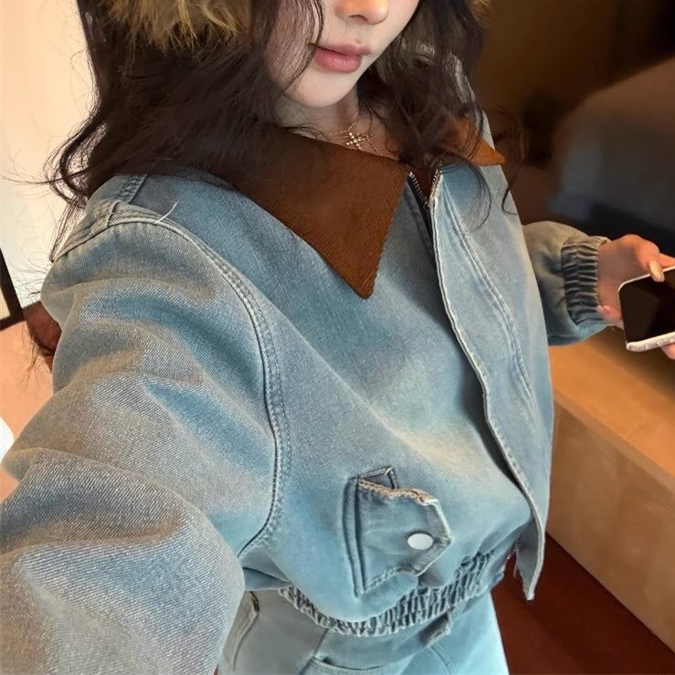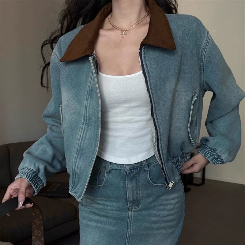 セットアップ デニム レディース 韓国 ファッション デニム上下 ブルゾン スカート ジップジャケット 襟 異素材ミックス ブルー ナロースカート