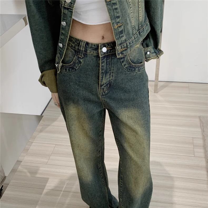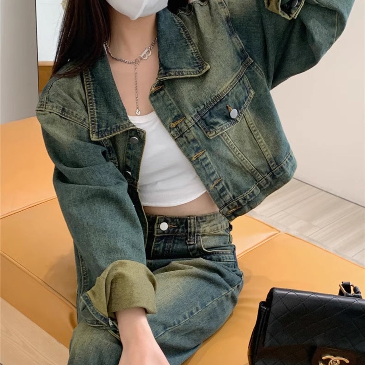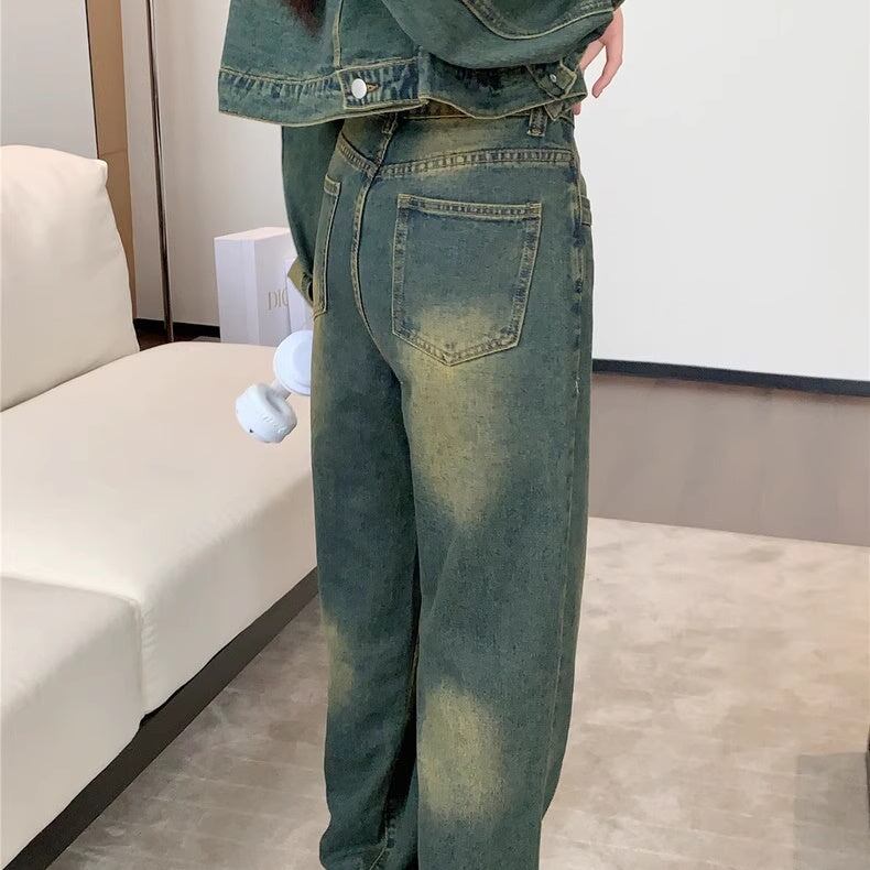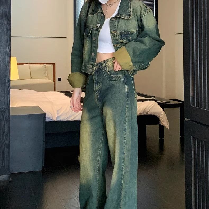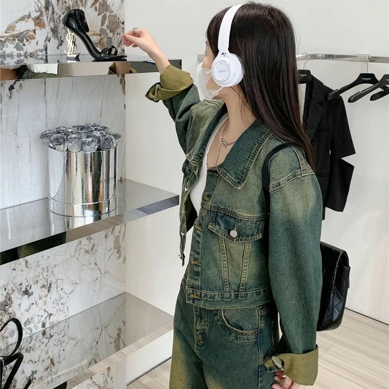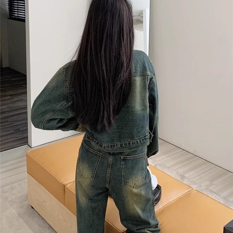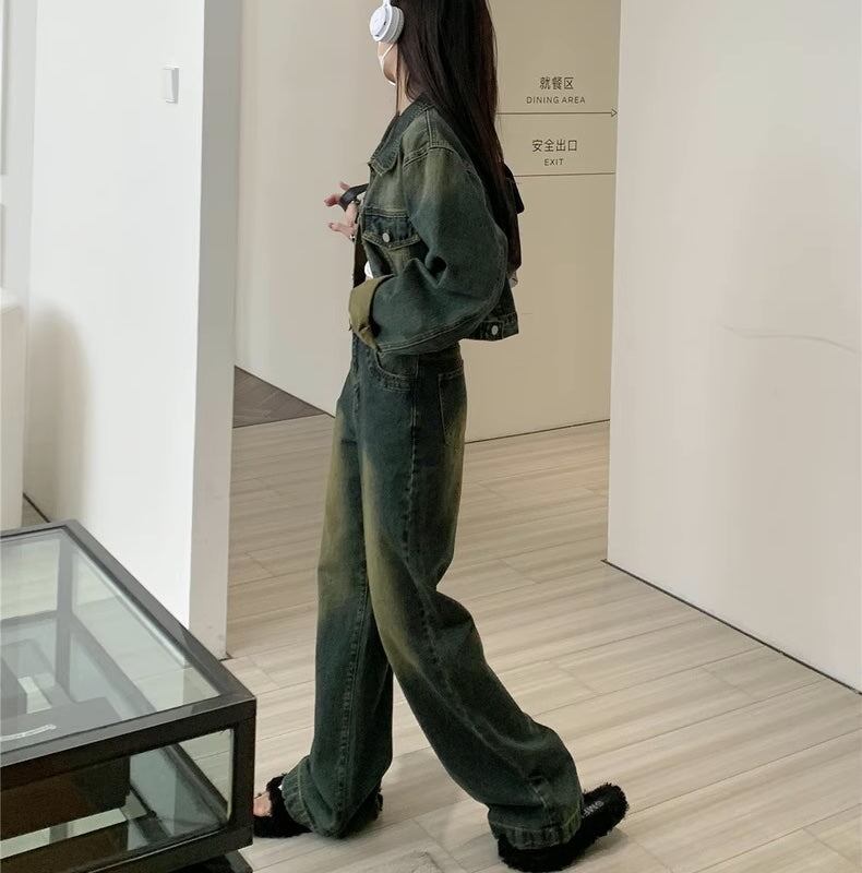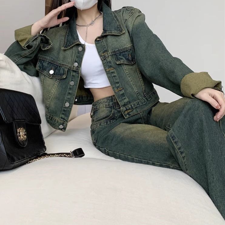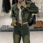 セットアップデニム レディース 韓国 ファッション クロップドジャケット デニム上下セット デニムジャケット デニムパンツ ビンテージ加工