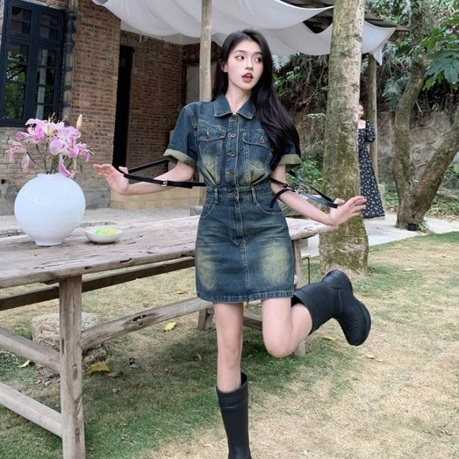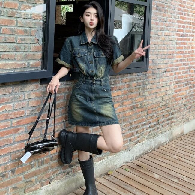 デニム セットアップ レディース 韓国 デニムオンデニム 半袖 ジャケット デニムミニスカート 上下セット ユーズド加工