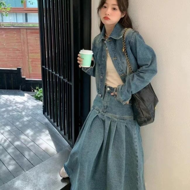 デニムセットアップ デニムジャケット レディース 韓国 ファッション Aラインスカート デニムロングスカート タック プリーツ 切り替えプリーツ レトロ かわいい 上下デニム