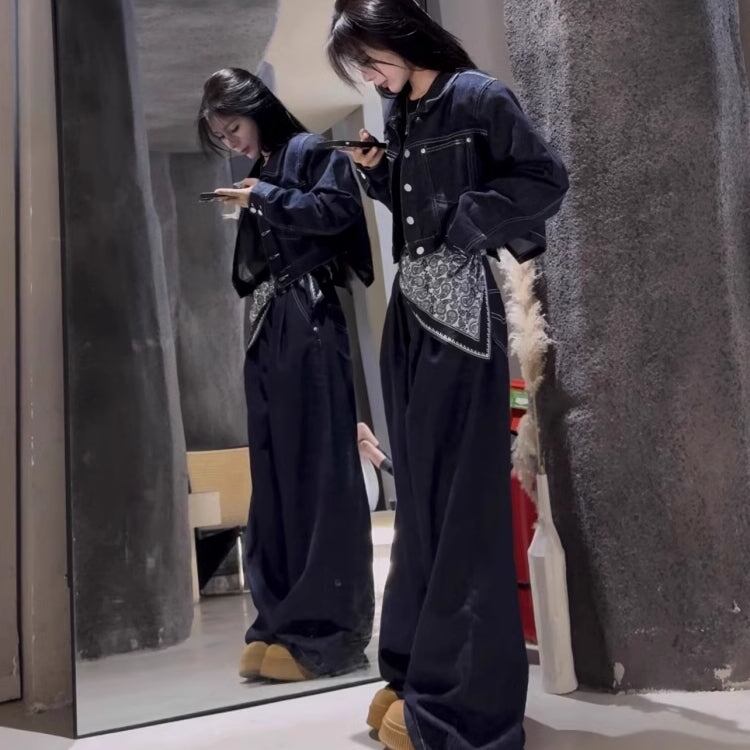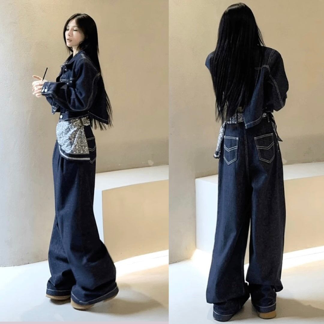 デニム セットアップ レディース 韓国 ファッション ワイドパンツ ショート デニムジャケット バックスリット インディゴカラー