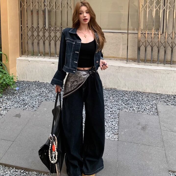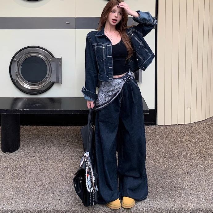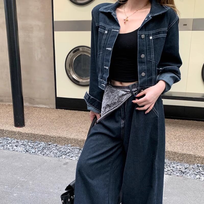 デニム セットアップ レディース 韓国 ファッション クロップ デニムジャケット デニムワイドパンツ インディゴブルー 上下2点セット