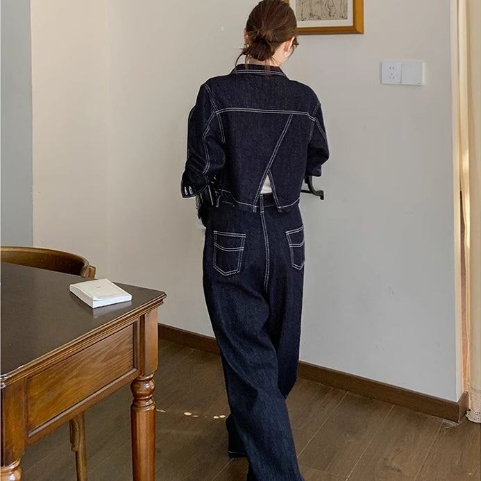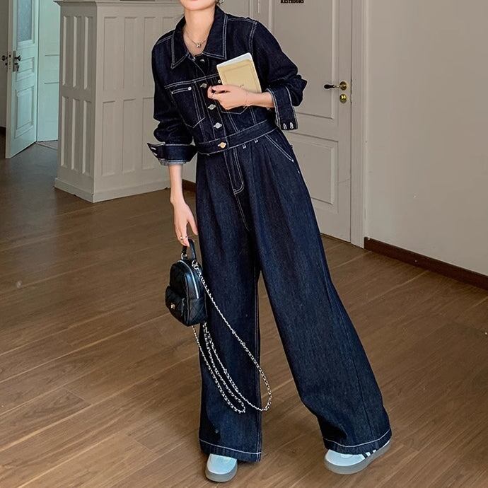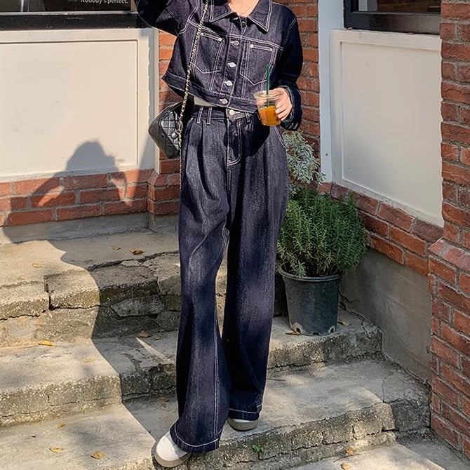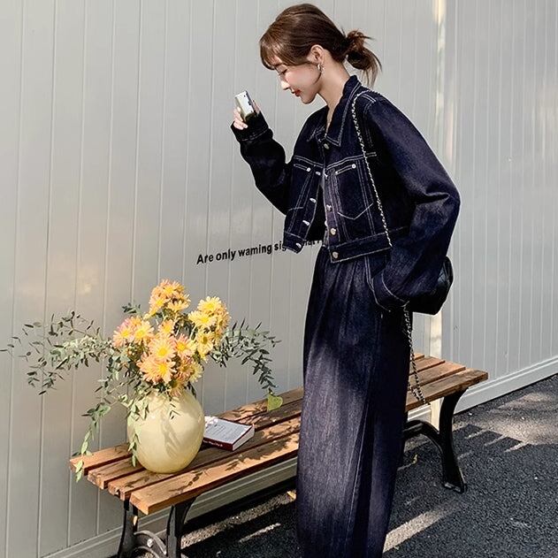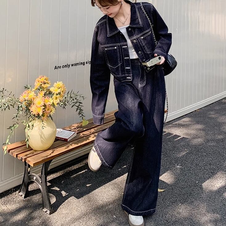 デニムセットアップ レディース 韓国 ファッション インディゴデニム 春 上下2点セット ワイドパンツ 薄手デニム クロップドデニムジャケット ロングパンツ