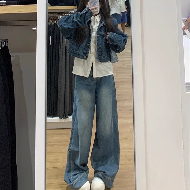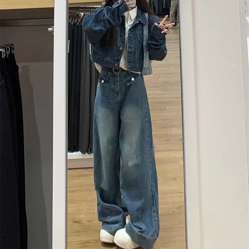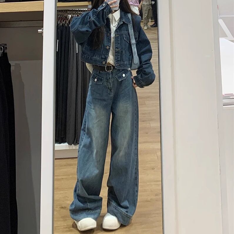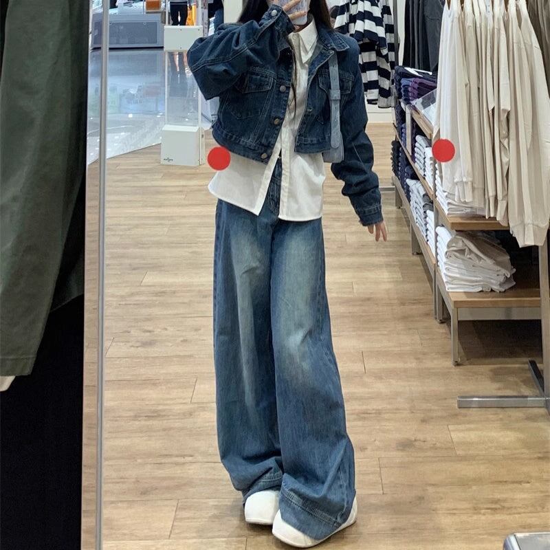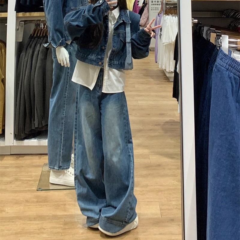 デニム セットアップ レディース 韓国 ファッション クロップド ヴィンテージ加工 デニムジャケット デニムワイドパンツ 上下セット デニムオンデニム スタイル