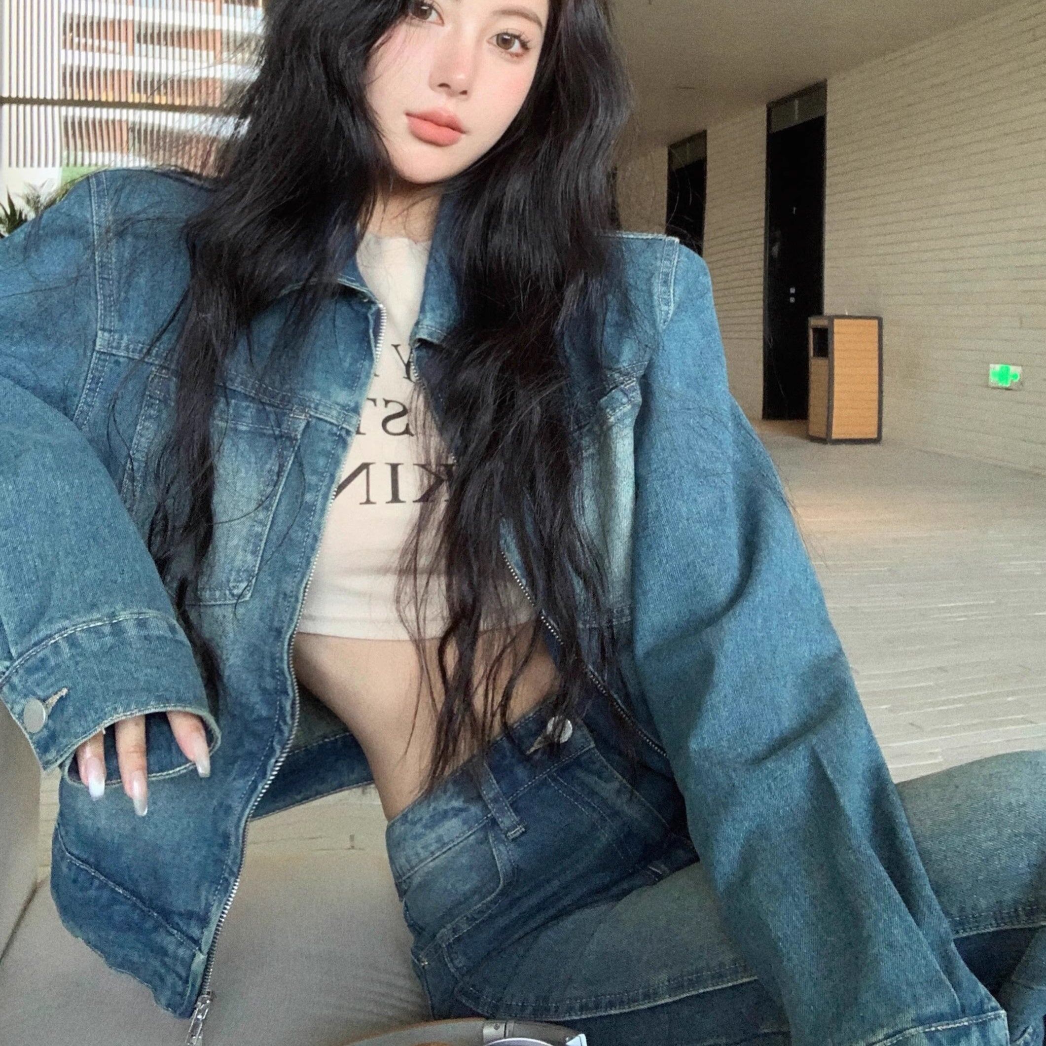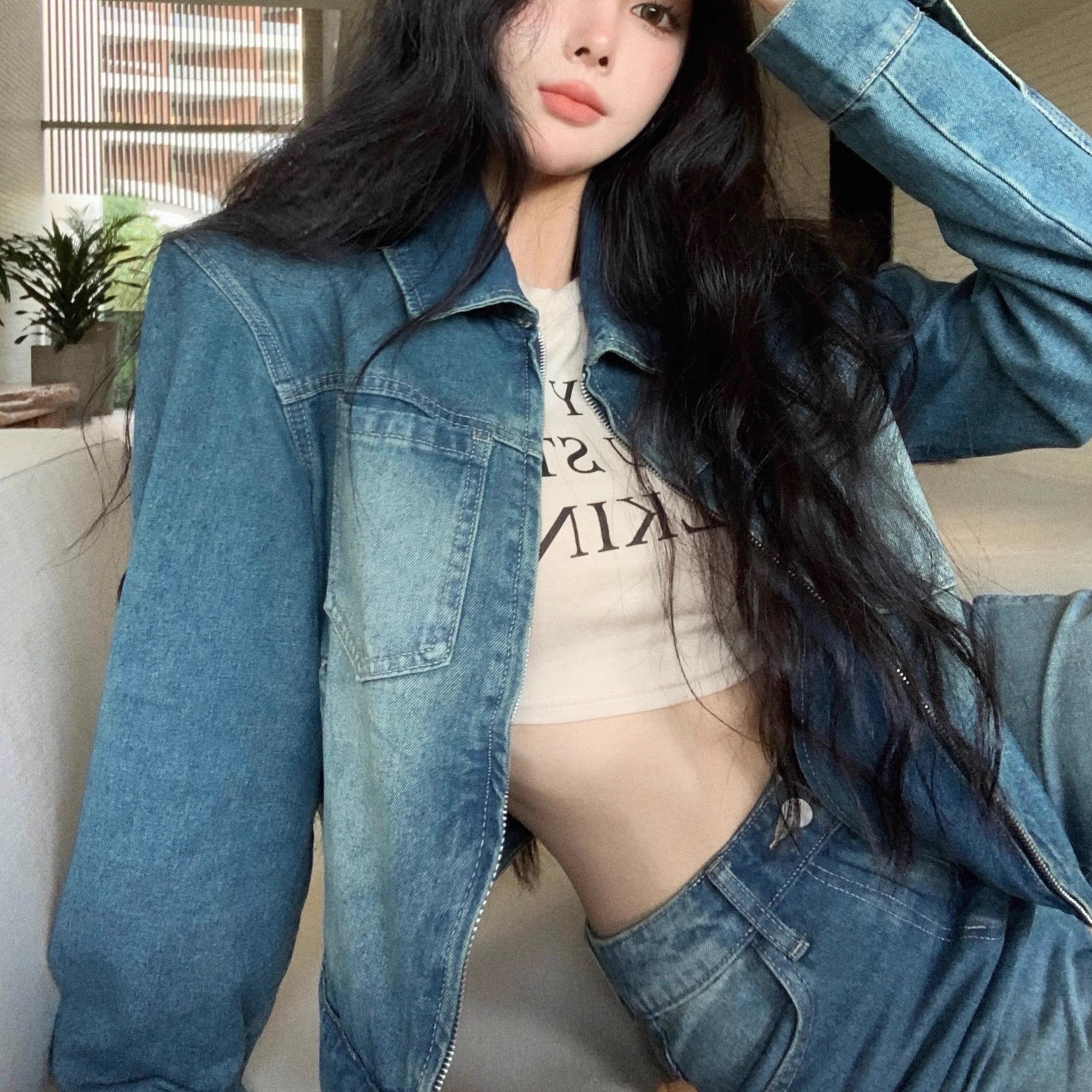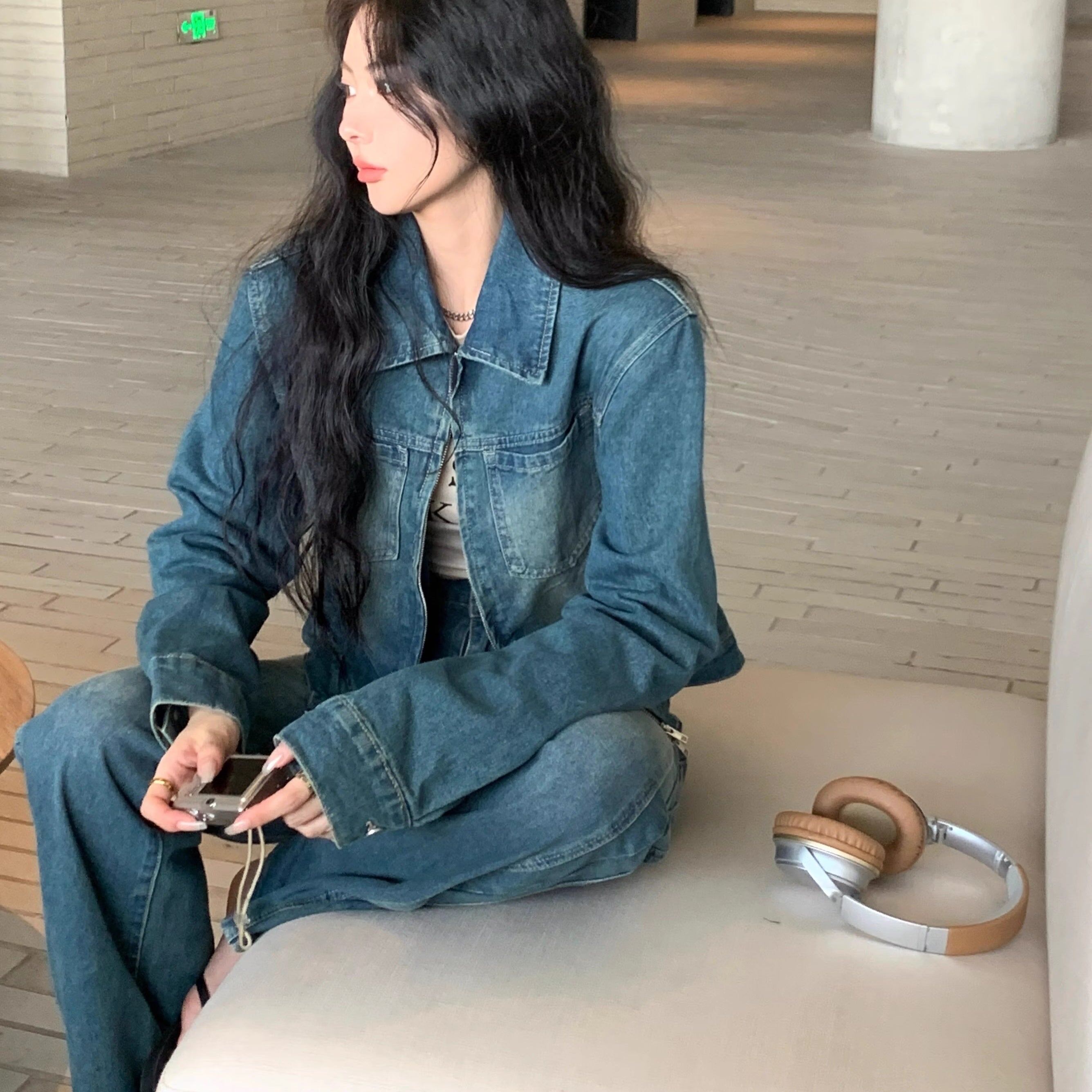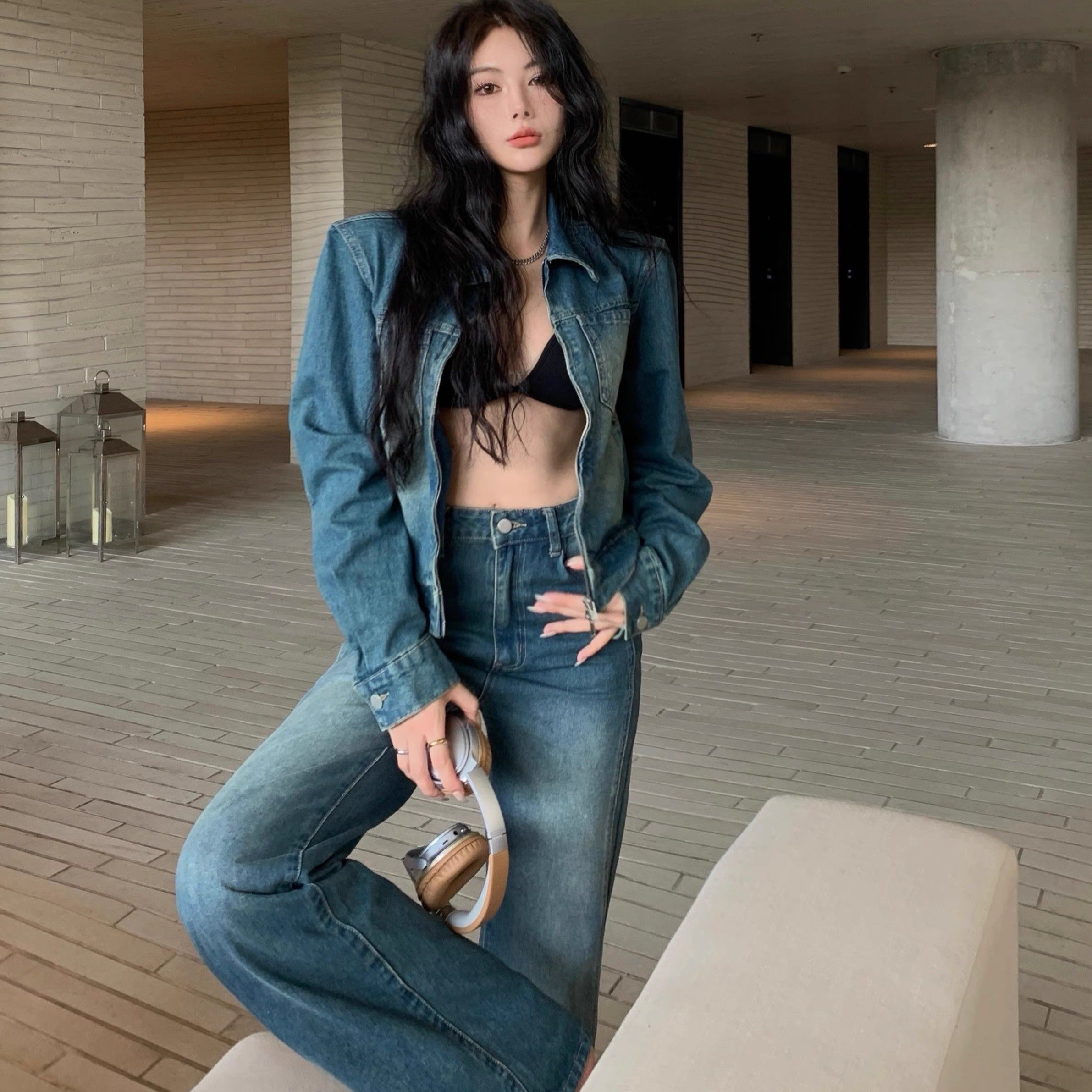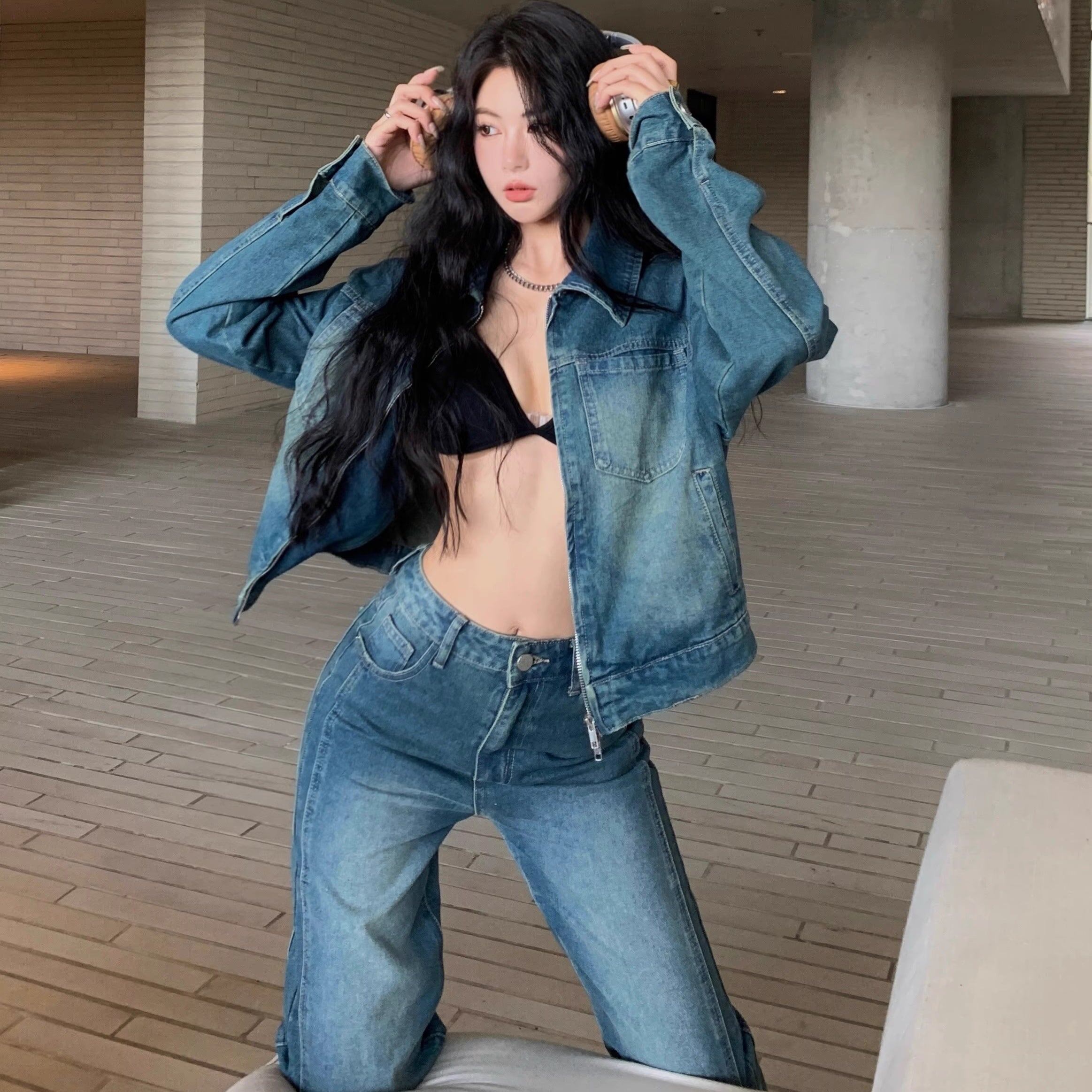デニムセットアップ レディース 韓国 ファッション ジップジャケット ロングうパンツ デニムパンツ 大きめ襟 レトロ ジャケット 胸ポケット