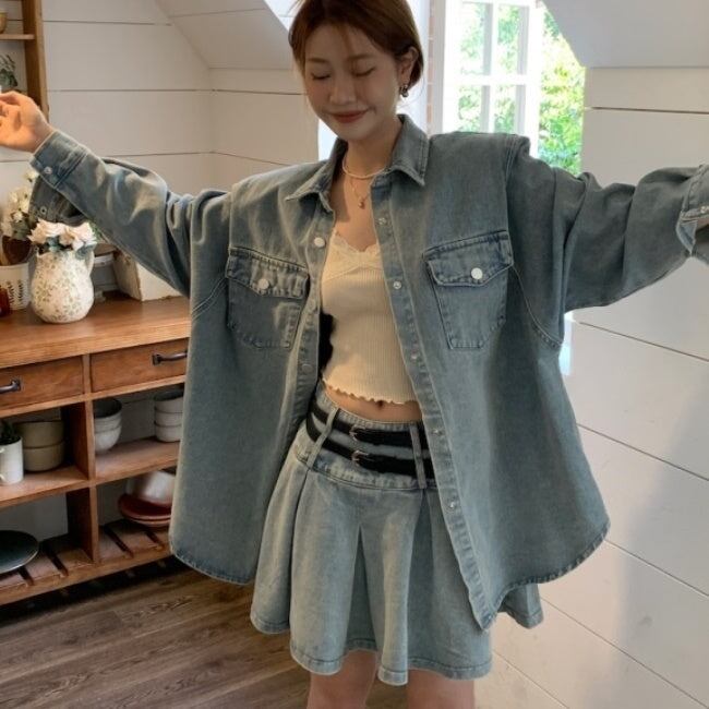 【素材】デニム ベルトつき デニムシャツ デニムニスカート 3点セット