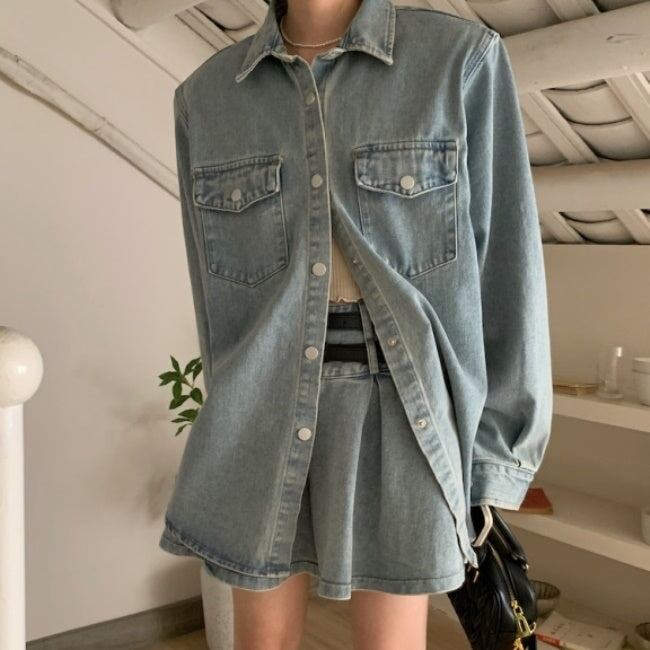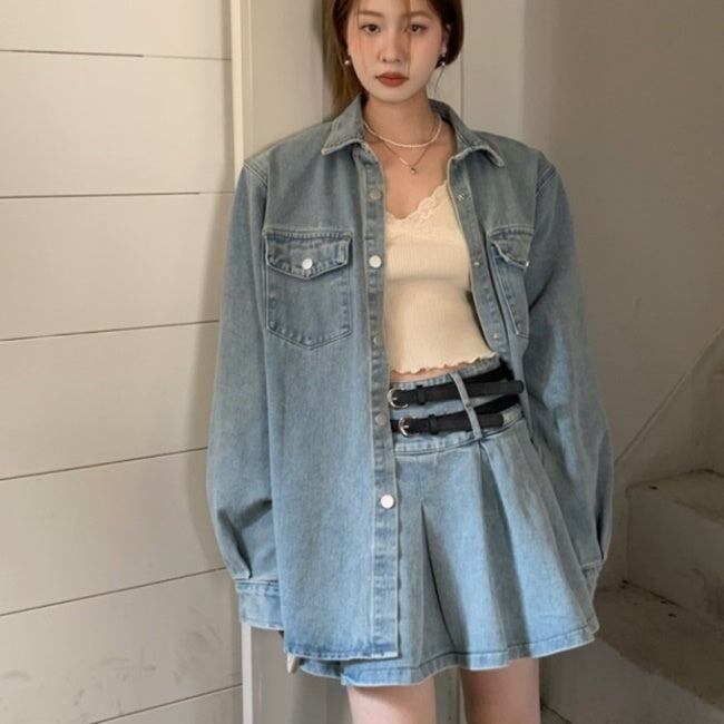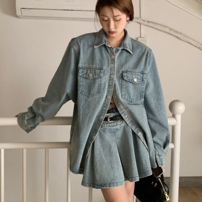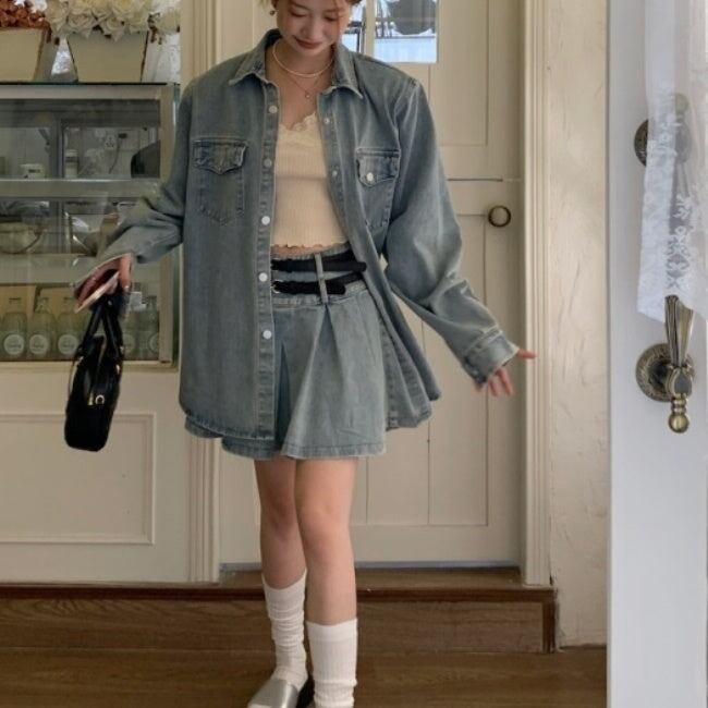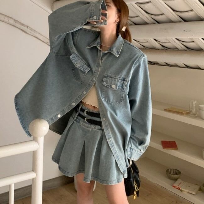 デニム セットアップ レディース 韓国 ファッション ミニスカート プリーツ ダンガリーシャツ フレアミニ 切り替え ライトブルー デニム上下