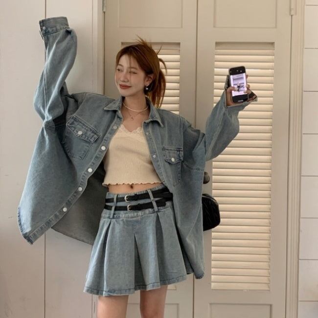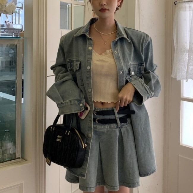 デニム セットアップ レディース 韓国 ファッション デニム ジャケット プリーツ ミニスカート 上下セット
