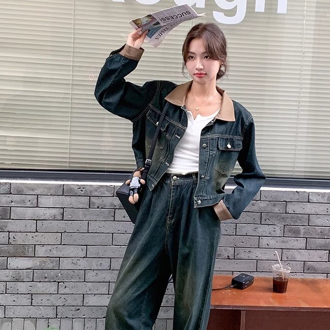デニムセットアップ レディース 韓国 ファッション 襟袖 異素材ミックス ビンテージデニム ダメージ加工 上下2点セット