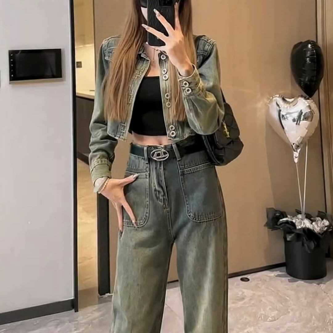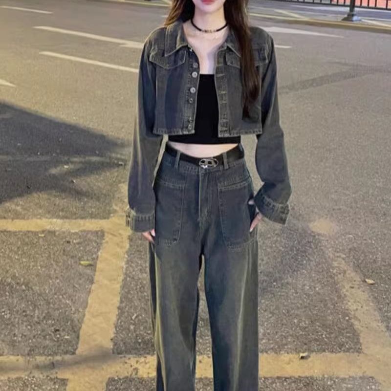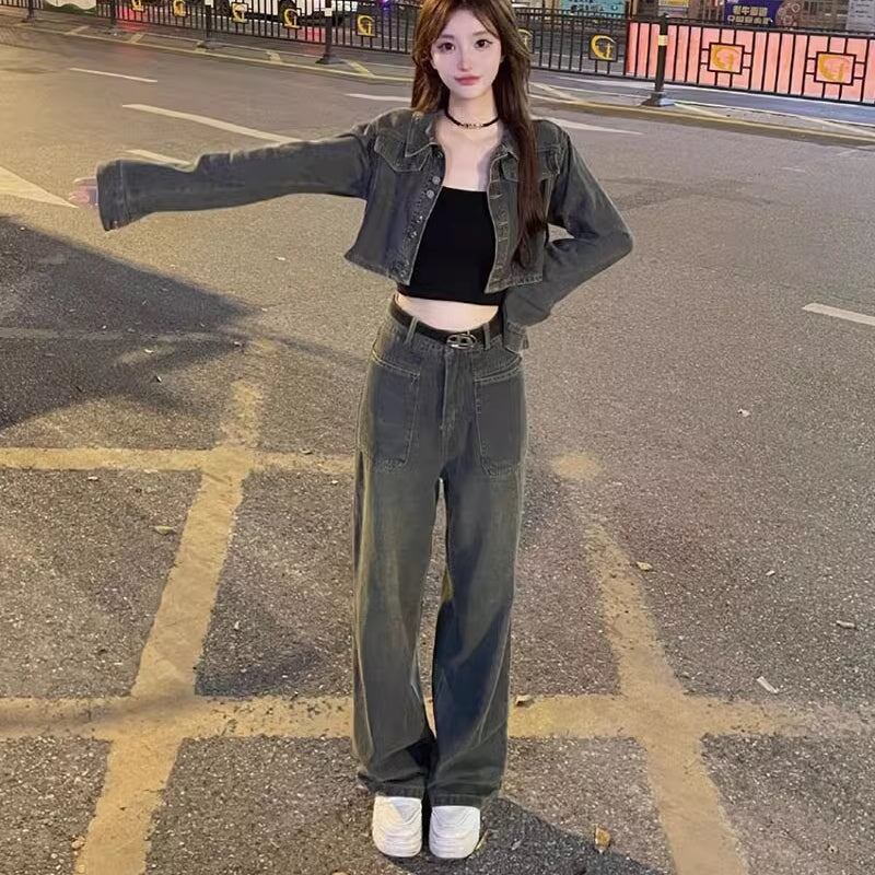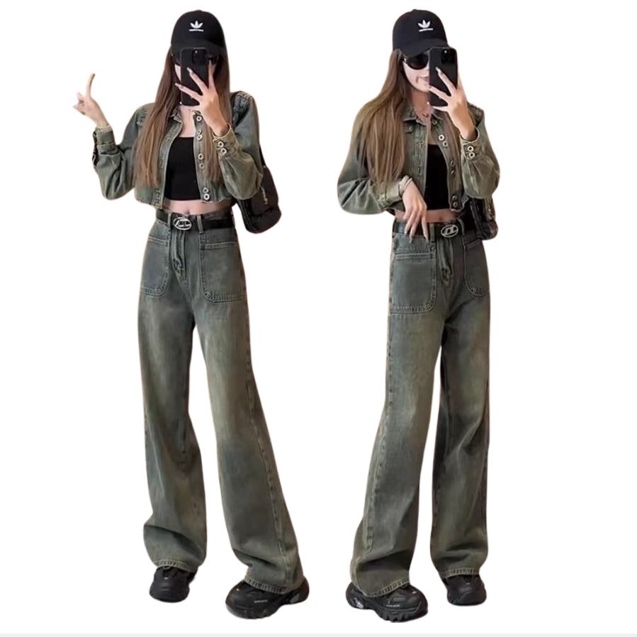 デニムセットアップ レディース 韓国 ファッション ビンテージカラー デニムジャケット クロップドジャケット ワイドパンツ デニムパンツ 春デニム