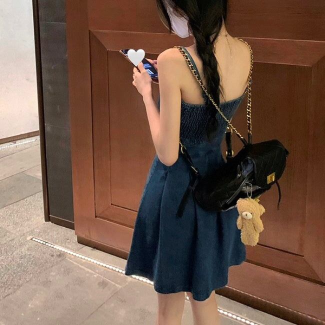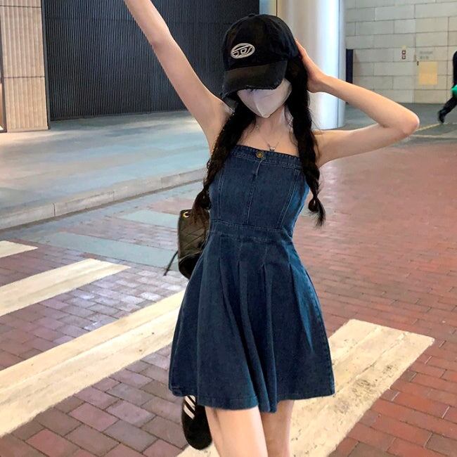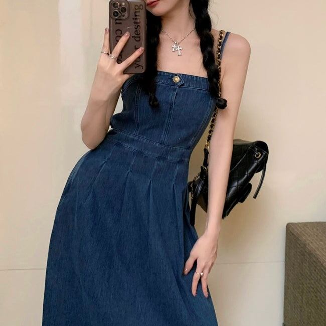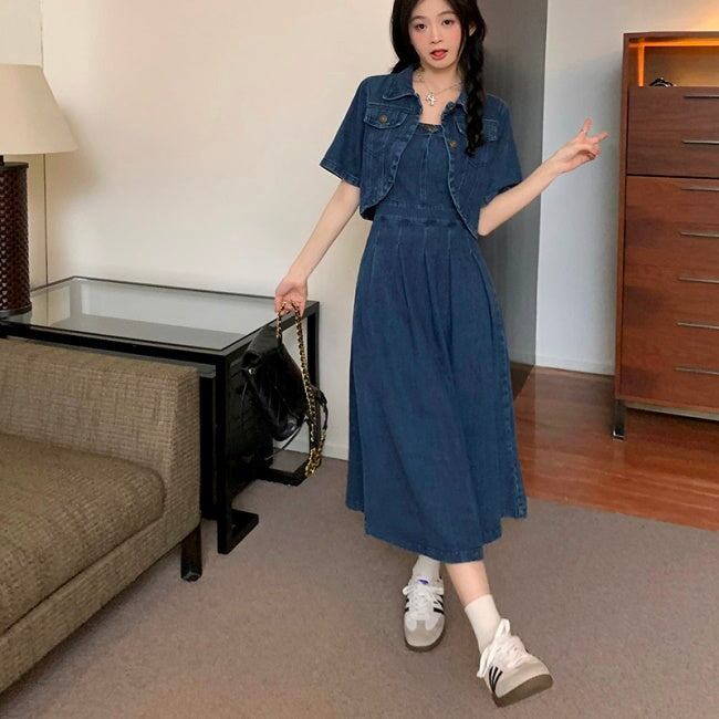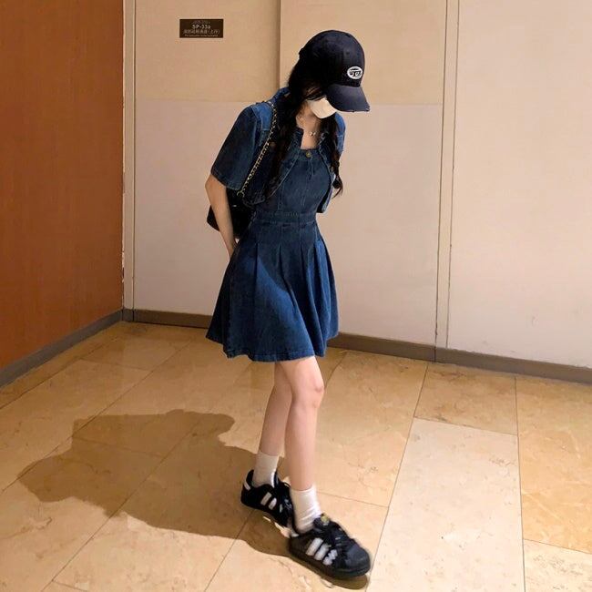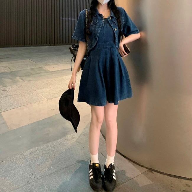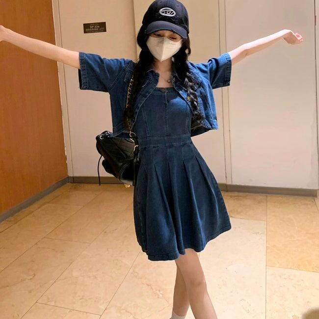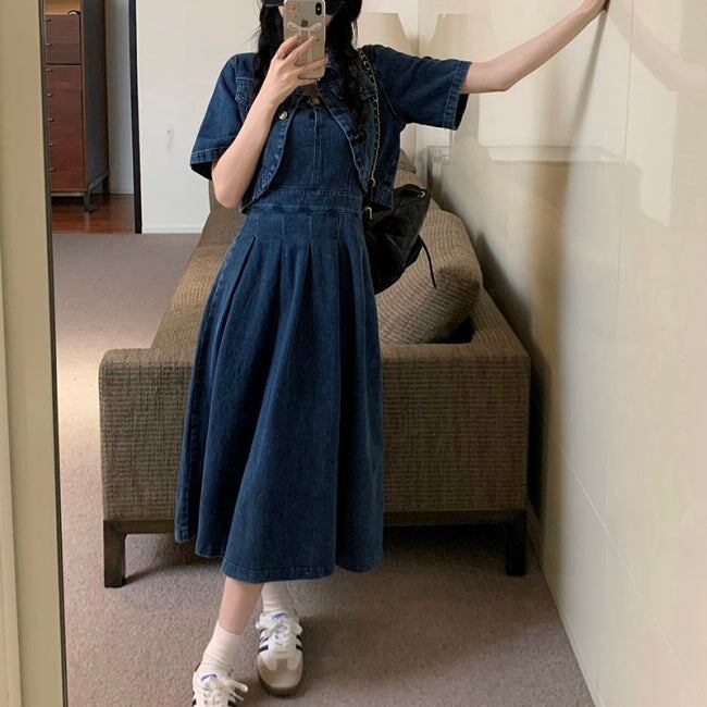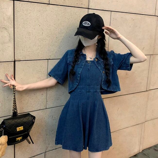 デニム セットアップ ワンピース レディース 韓国 ファッション デニムジャケット デニムワンピース タックプリーツ フレア キャミワンピ デニムオンデニム