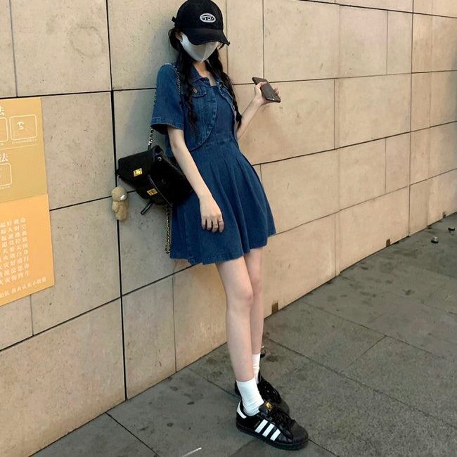 デニムセットアップ ワンピース レディース 韓国 ファッション デニムジャケット デニムワンピース タックプリーツ フレア キャミワンピ デニムオンデニム
