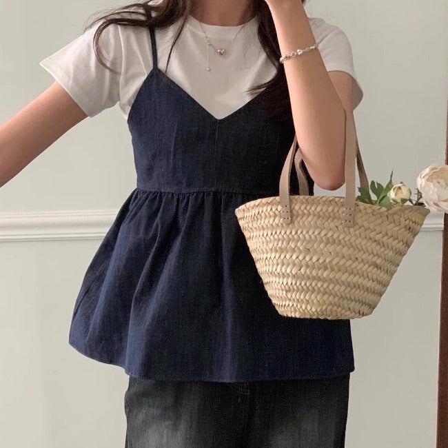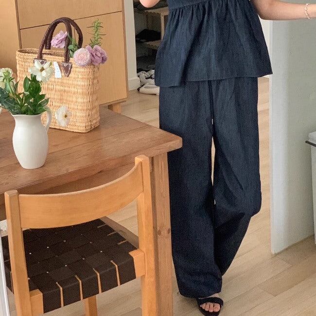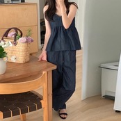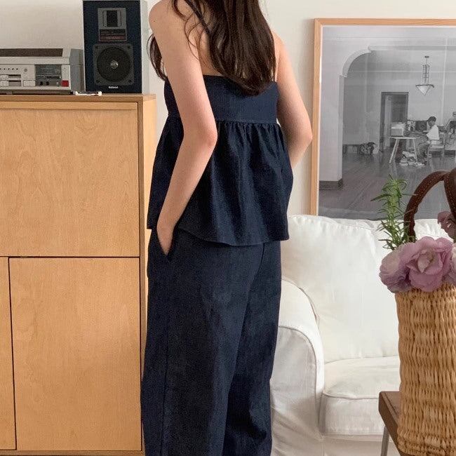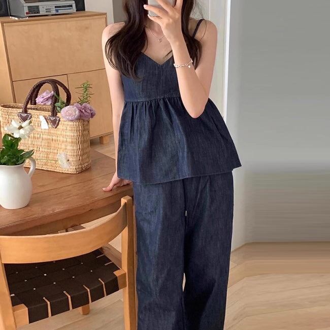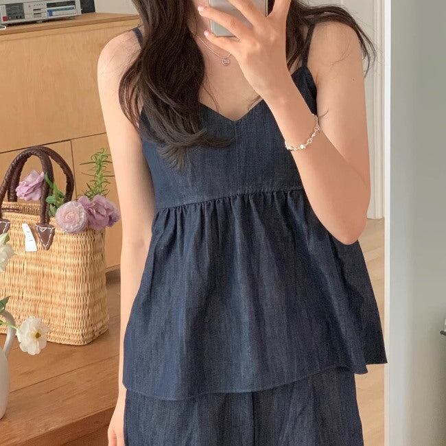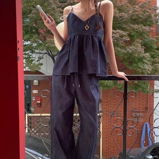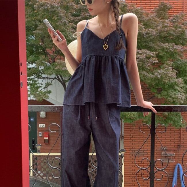 デニム セットアップ 夏 レディース 韓国 ファッション キャミソール パンツ ペプラム フレア ハイウエスト 2点セット パンツ上下 夏コーデ
