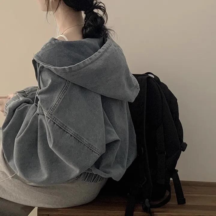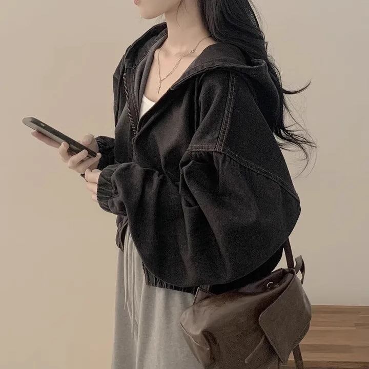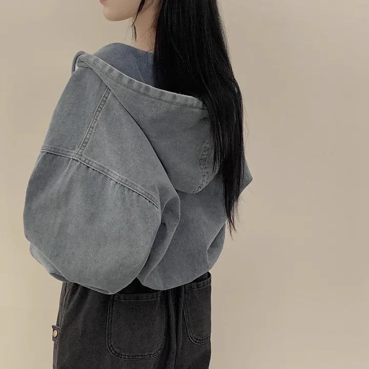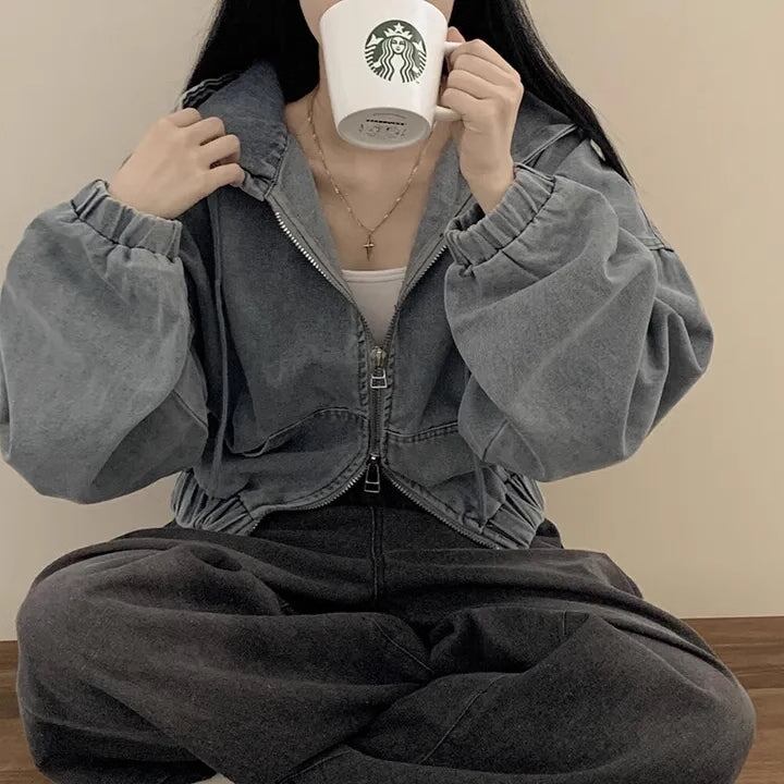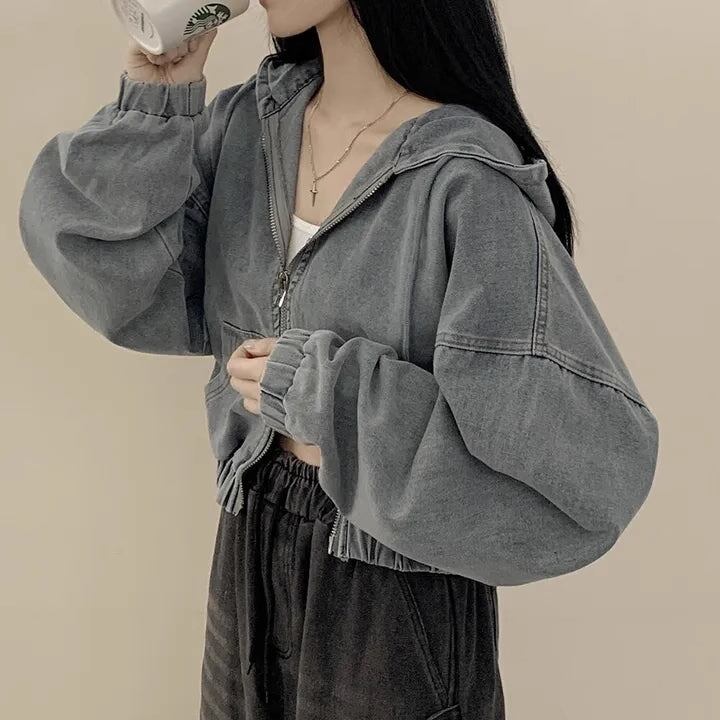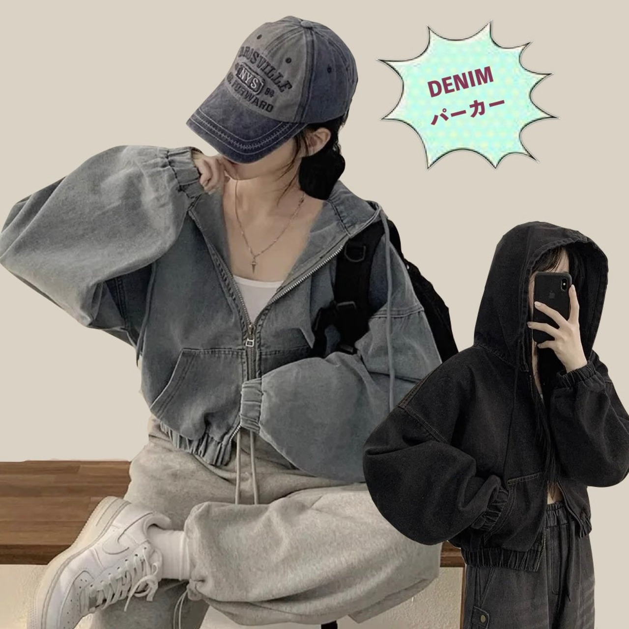 デニムパーカー レディース 韓国 ファッション ジップアウター ジップパーカー クロップド丈 ショート丈 フード ジャケット ビンテージ ダメージ加工 おしゃれ