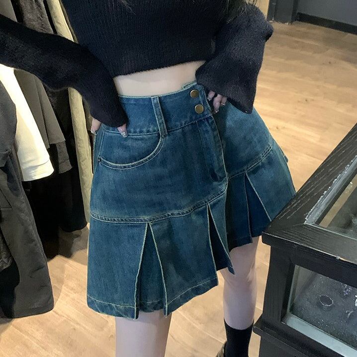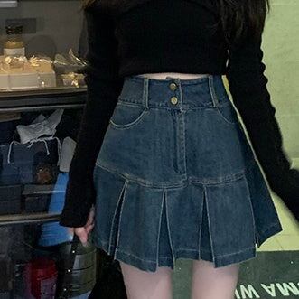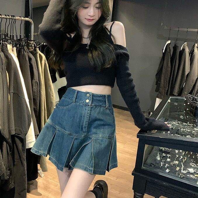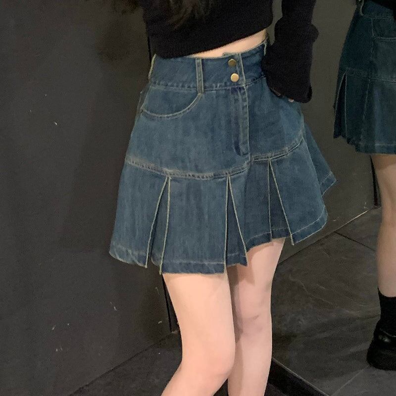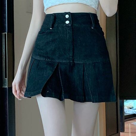 デニム プリーツスカート レディース 韓国 ファッション ミニスカート 切り替えプリーツ 太めプリーツ 黒デニム