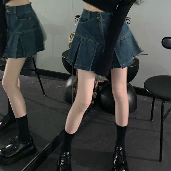 太めプリーツミニスカート♪ブルーデニム、ブラックデニム
