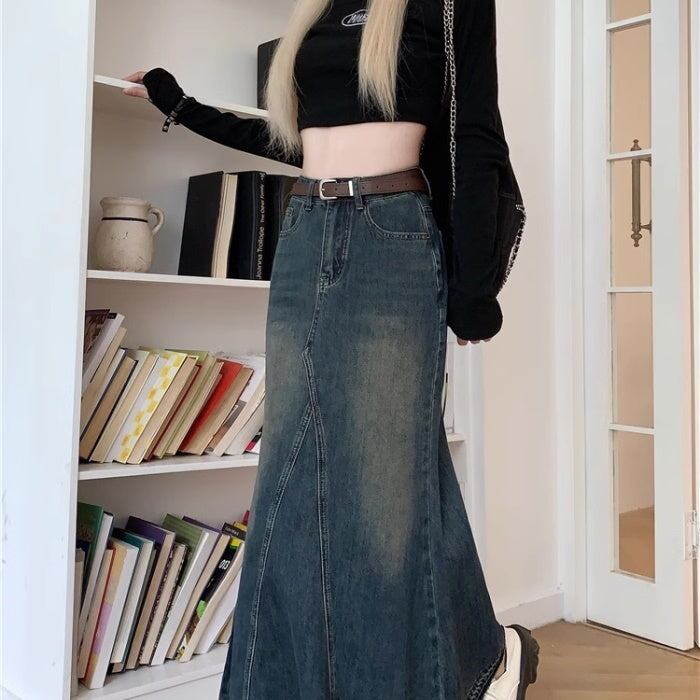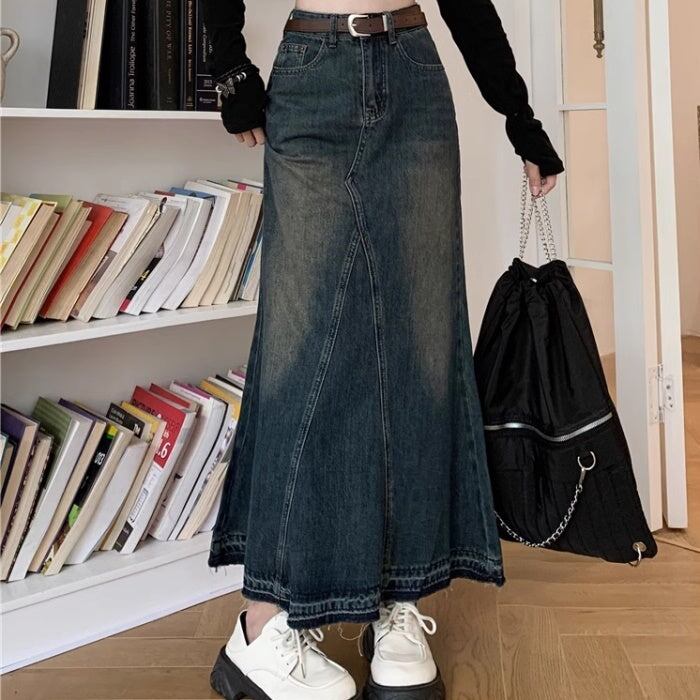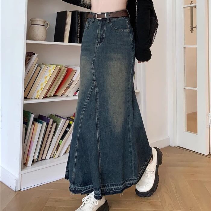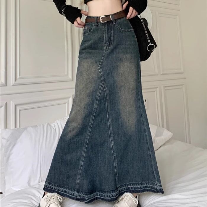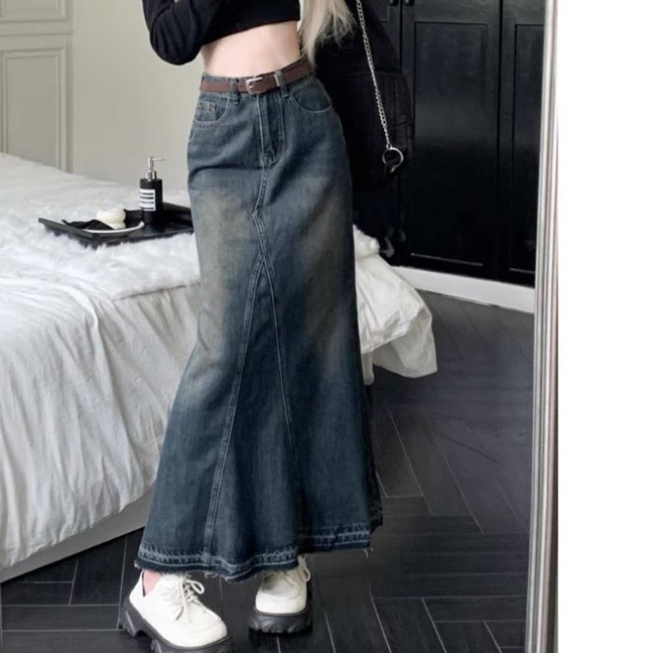 デニム マーメイド ロングスカート 韓国 ファッション レディース フレア ヴィンテージ加工 デニムスカート