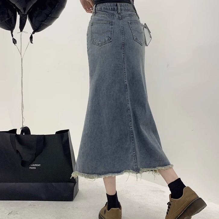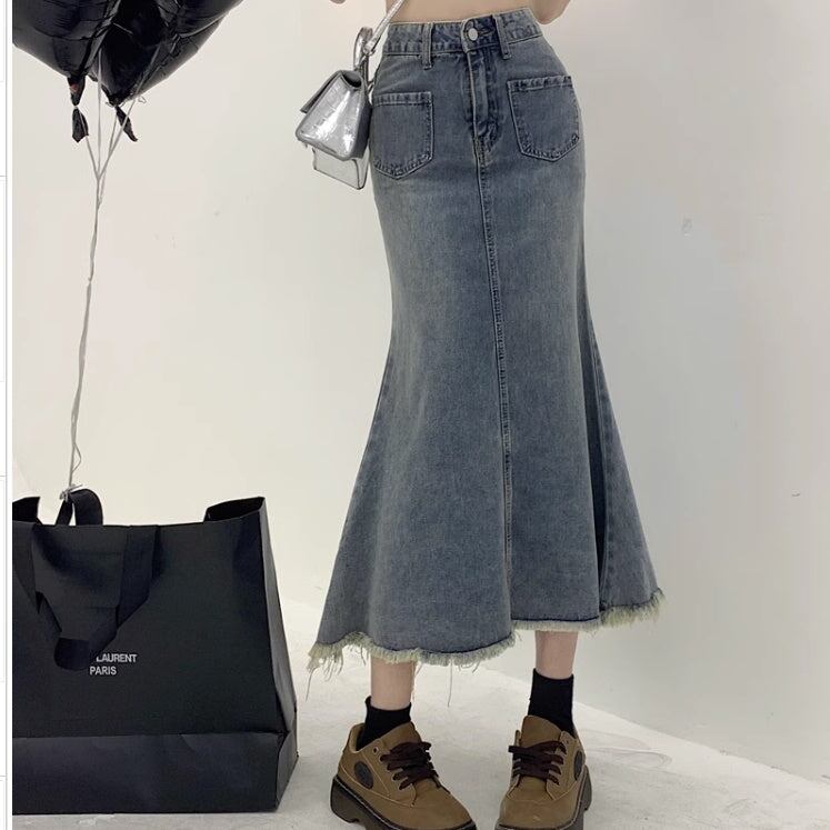 デニム マーメイドスカート 韓国 レディース ファッション? Aラインフレア ロング デニムスカート