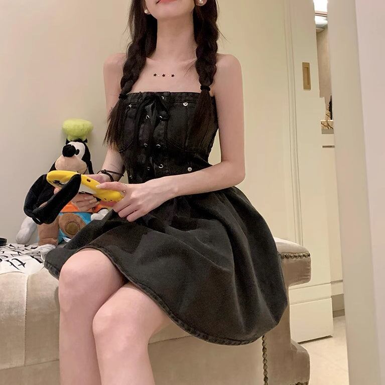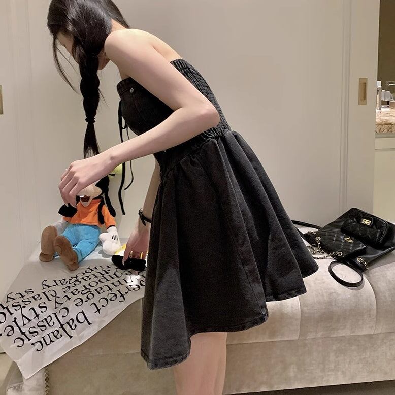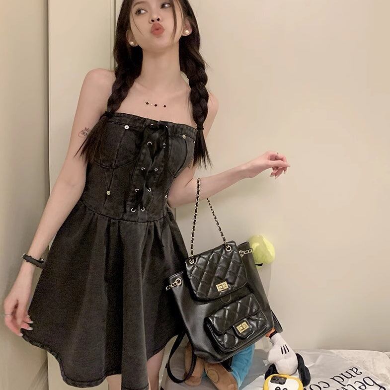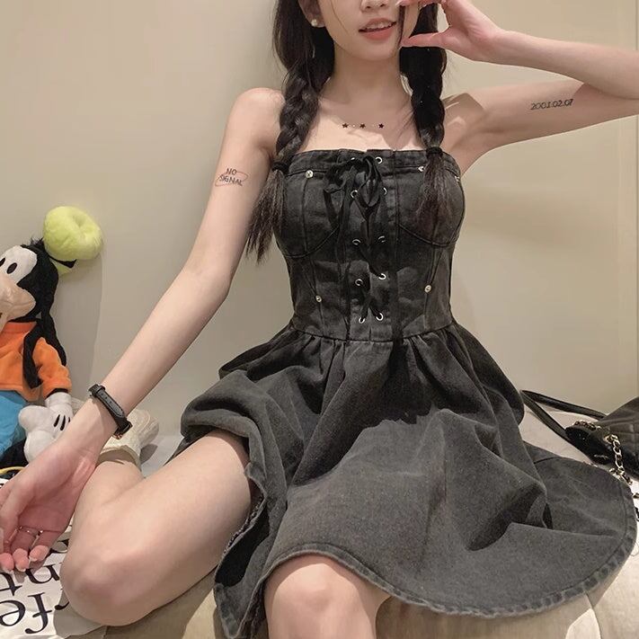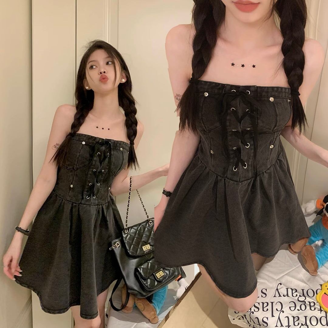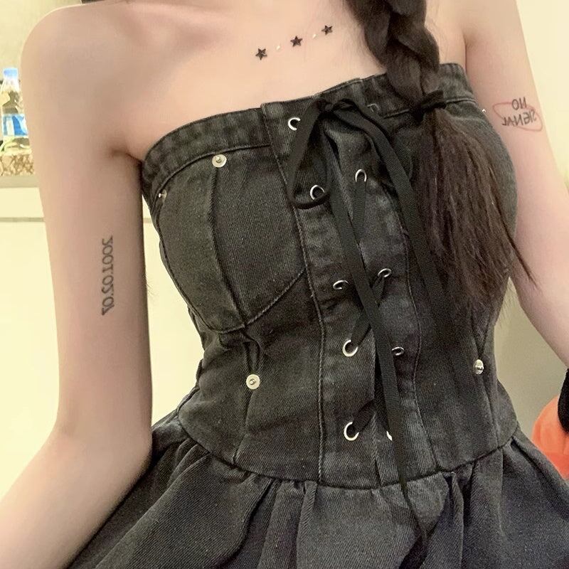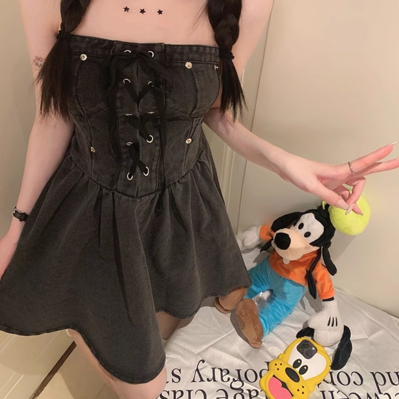 ワンピース デニム レディース 韓国 ファッション チューブトップ ワンピ かわいい レースアップ オフショルダー 肩出し ビスチェ リボン ガーリー 切り替えフレア 夏ワンピ