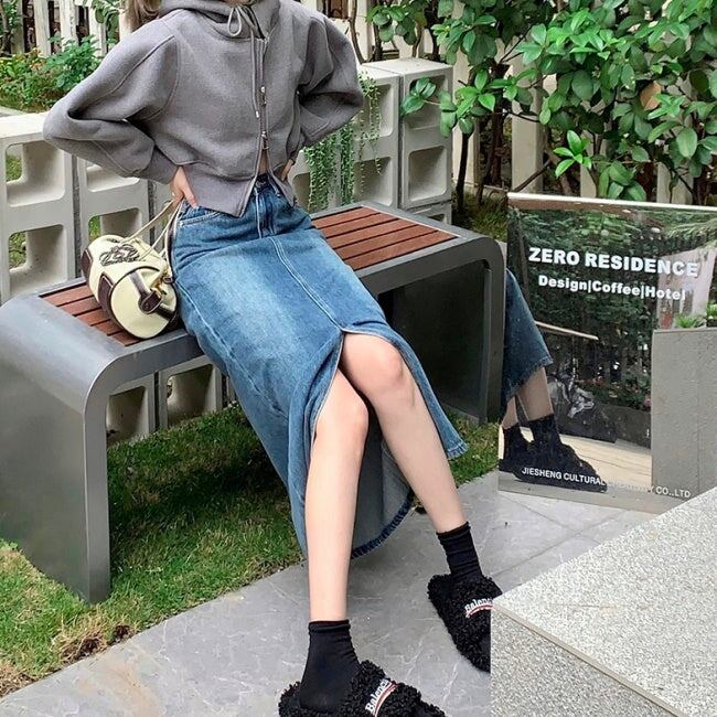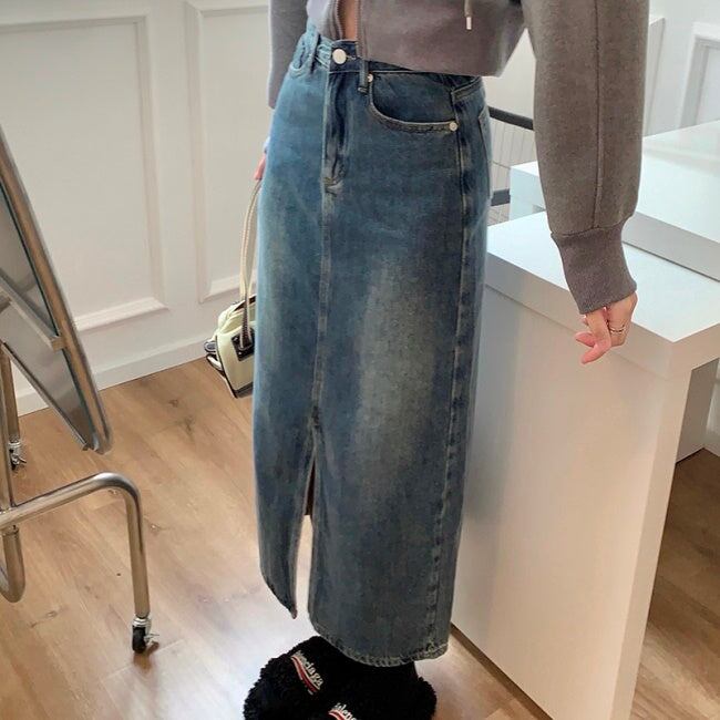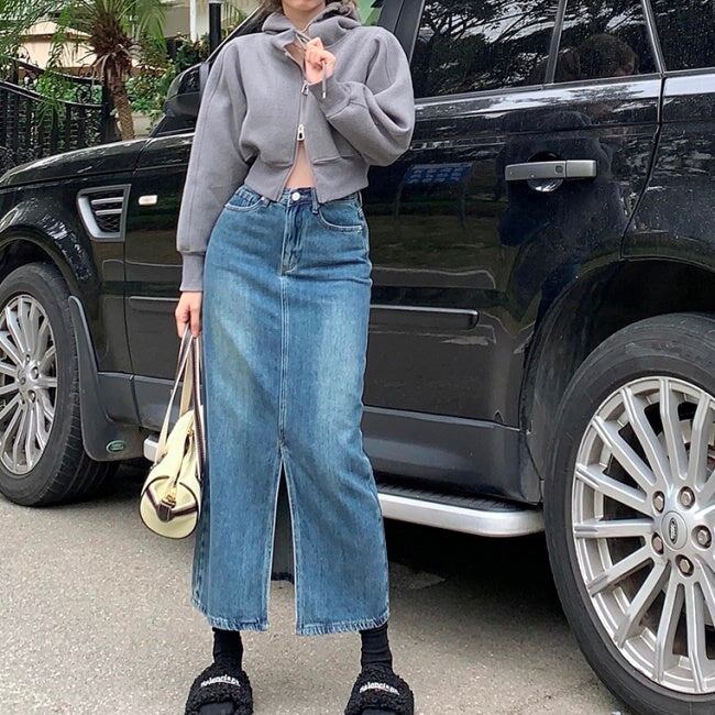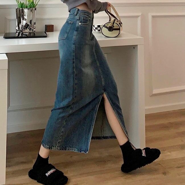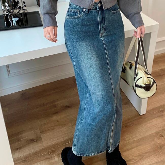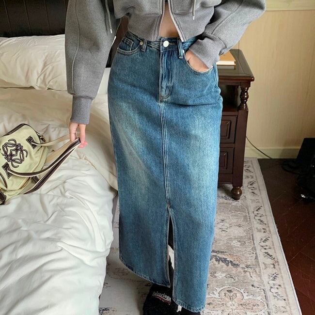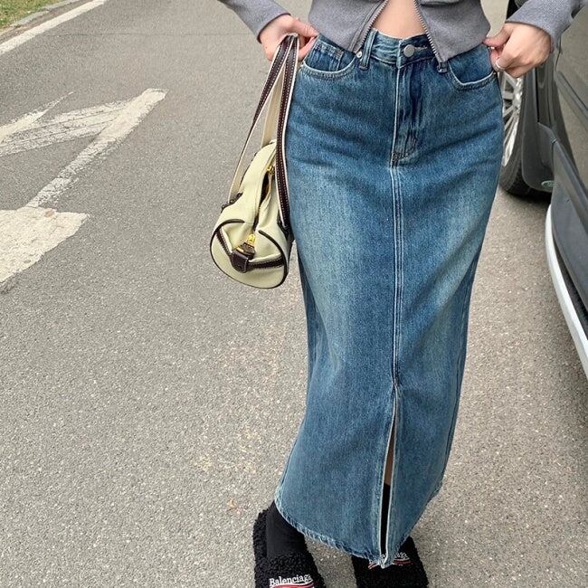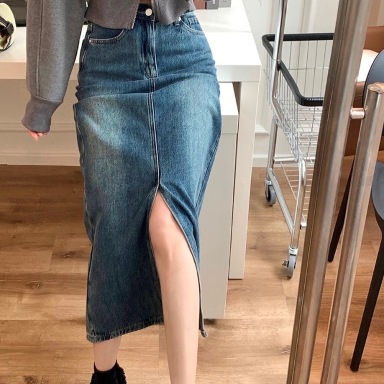 デニム スカート ロング レディース 韓国 ファッション フロントスリット レトロ かわいい タイト デニムボトム