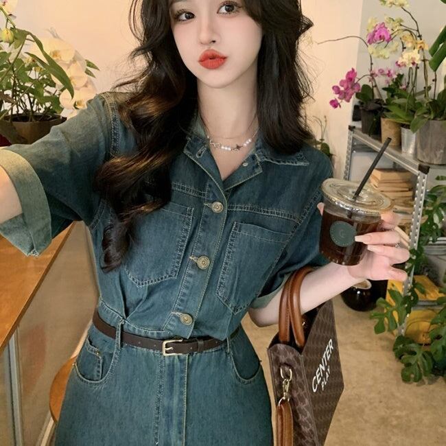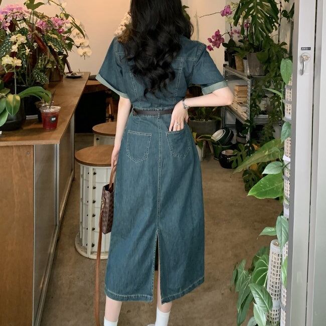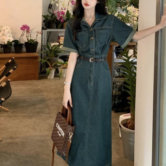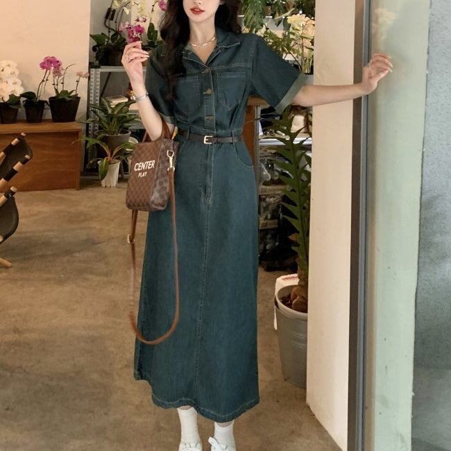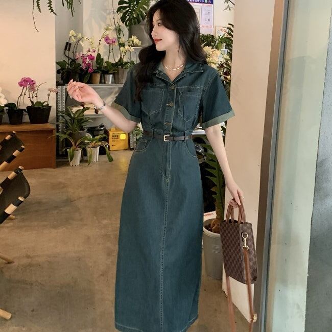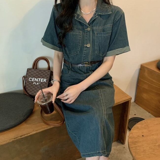 デニム ロングワンピース レディース 韓国 半袖 ジーンズ ワンピース 夏服 デニムワンピ