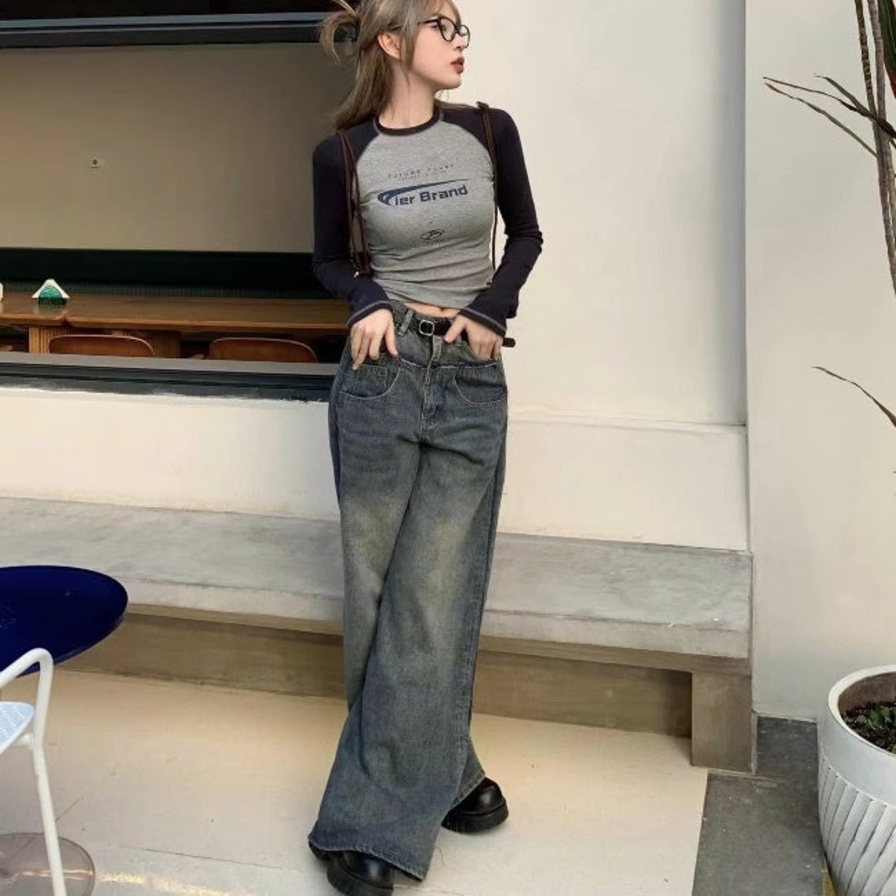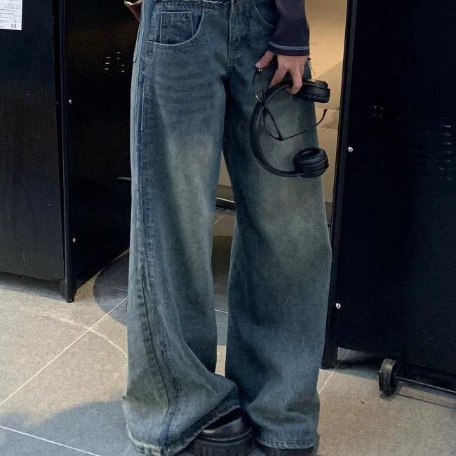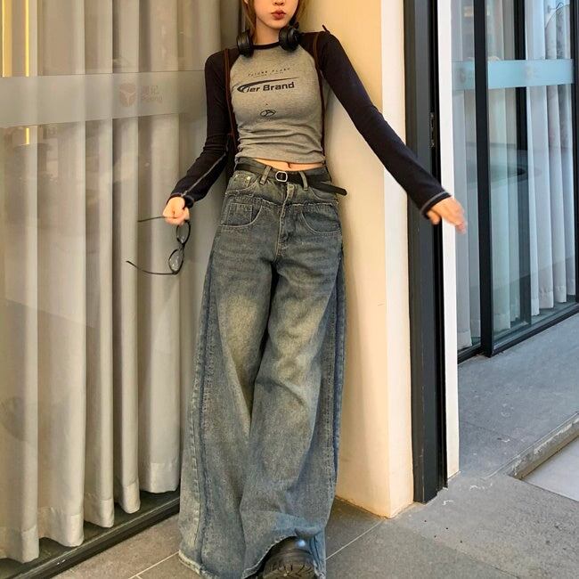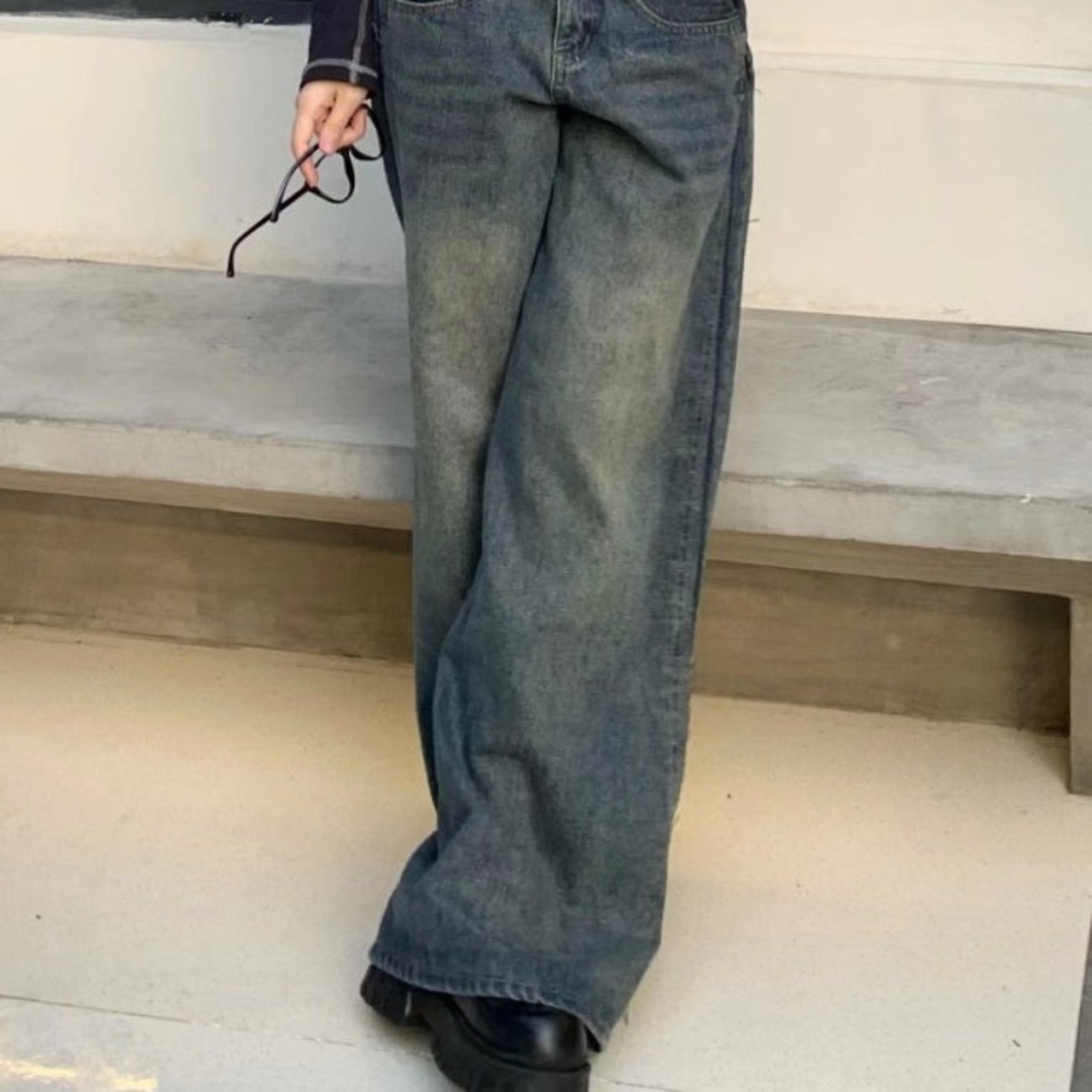 デニム ワイドパンツ レディース デニムモップパンツ 韓国 ファッション デニム ヴィンテージ リメイク加工