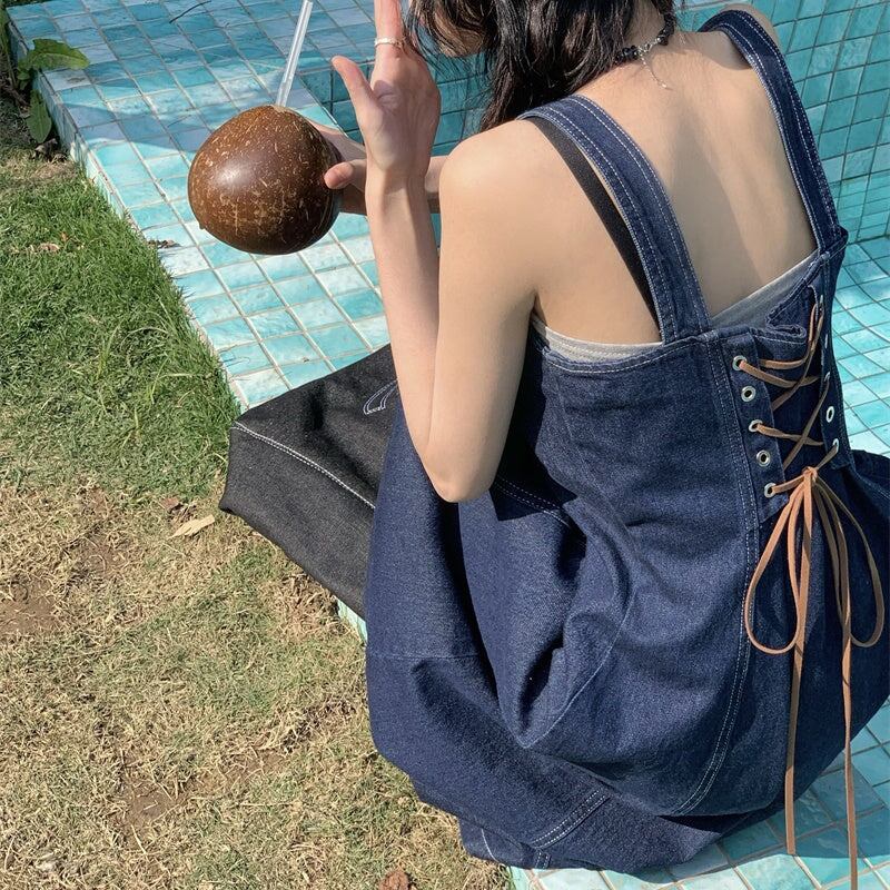 デニム ジャンパースカート レディース 韓国 ファッション ワンピース バックシャン レースアップ おしゃれ デニムワンピース