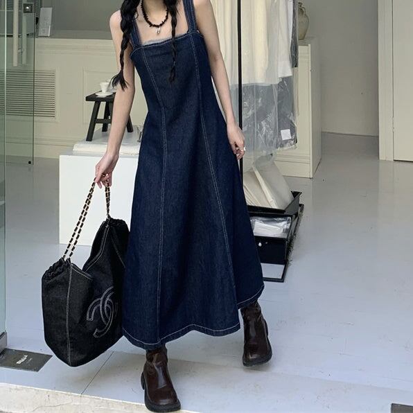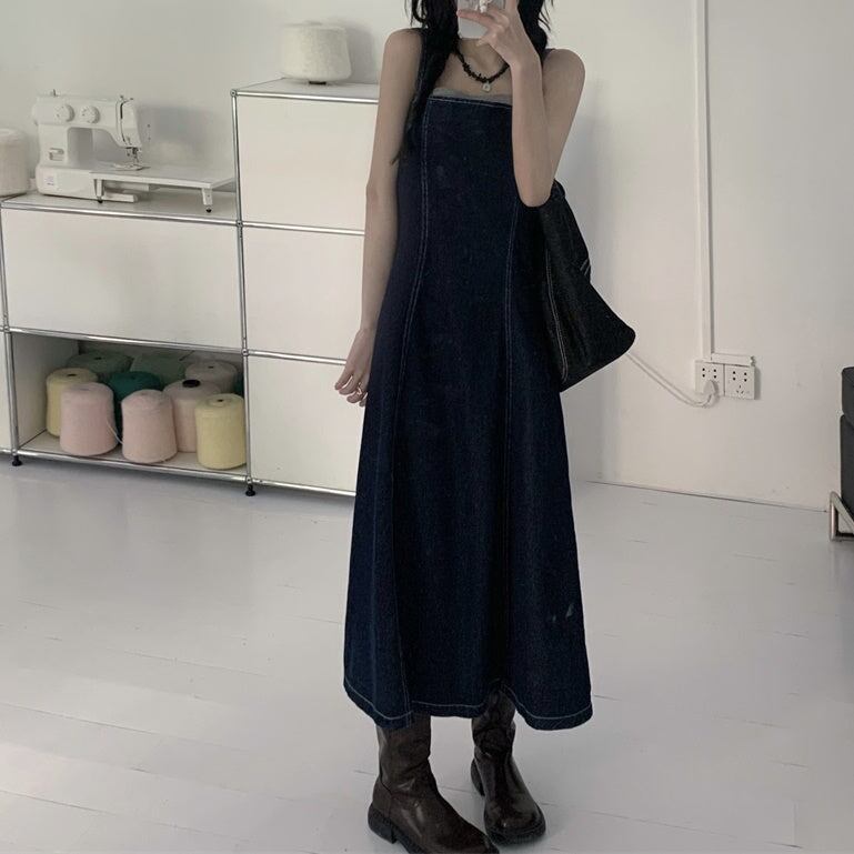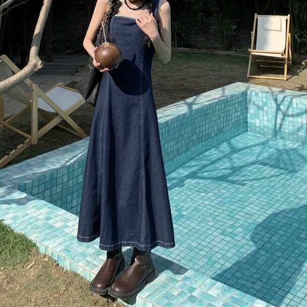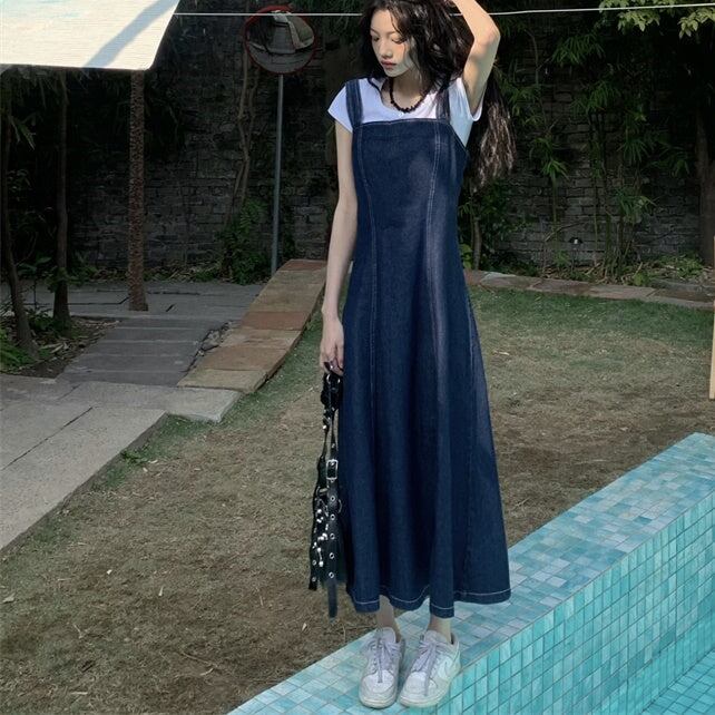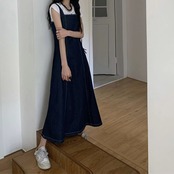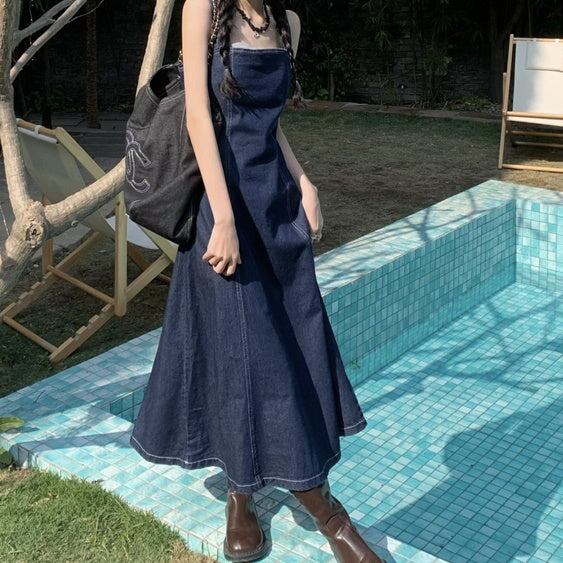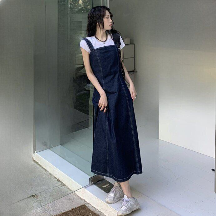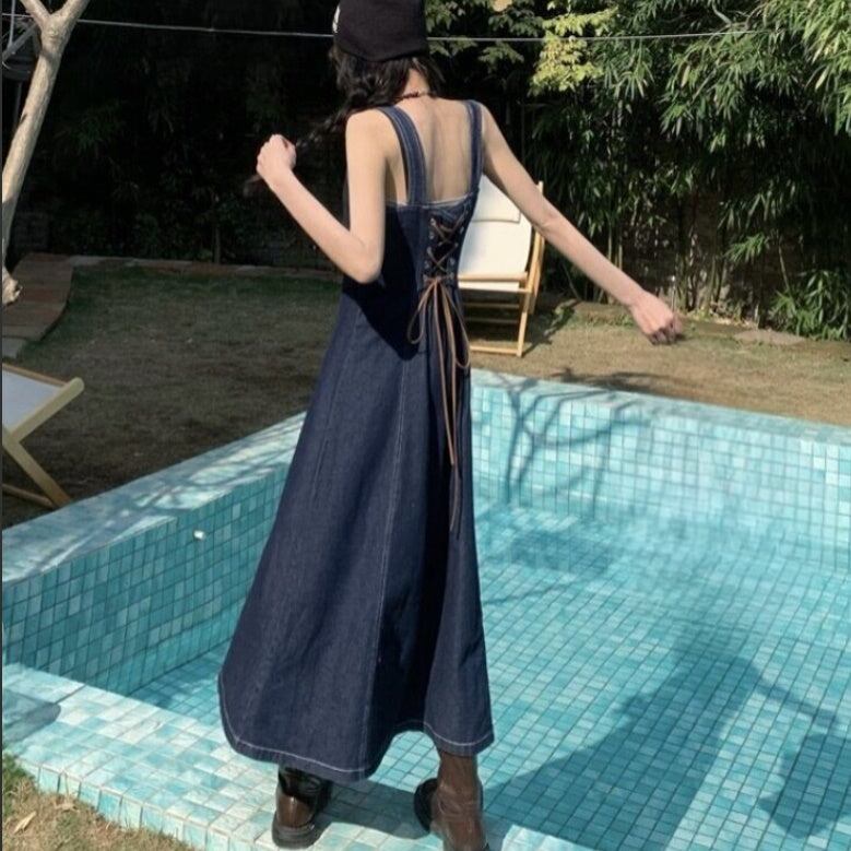 デニム ワンピース ジャンパースカート 韓国 ファッション デニム ロングワンピ ジャンスカ バックシャン レースアップ 夏 ファッション