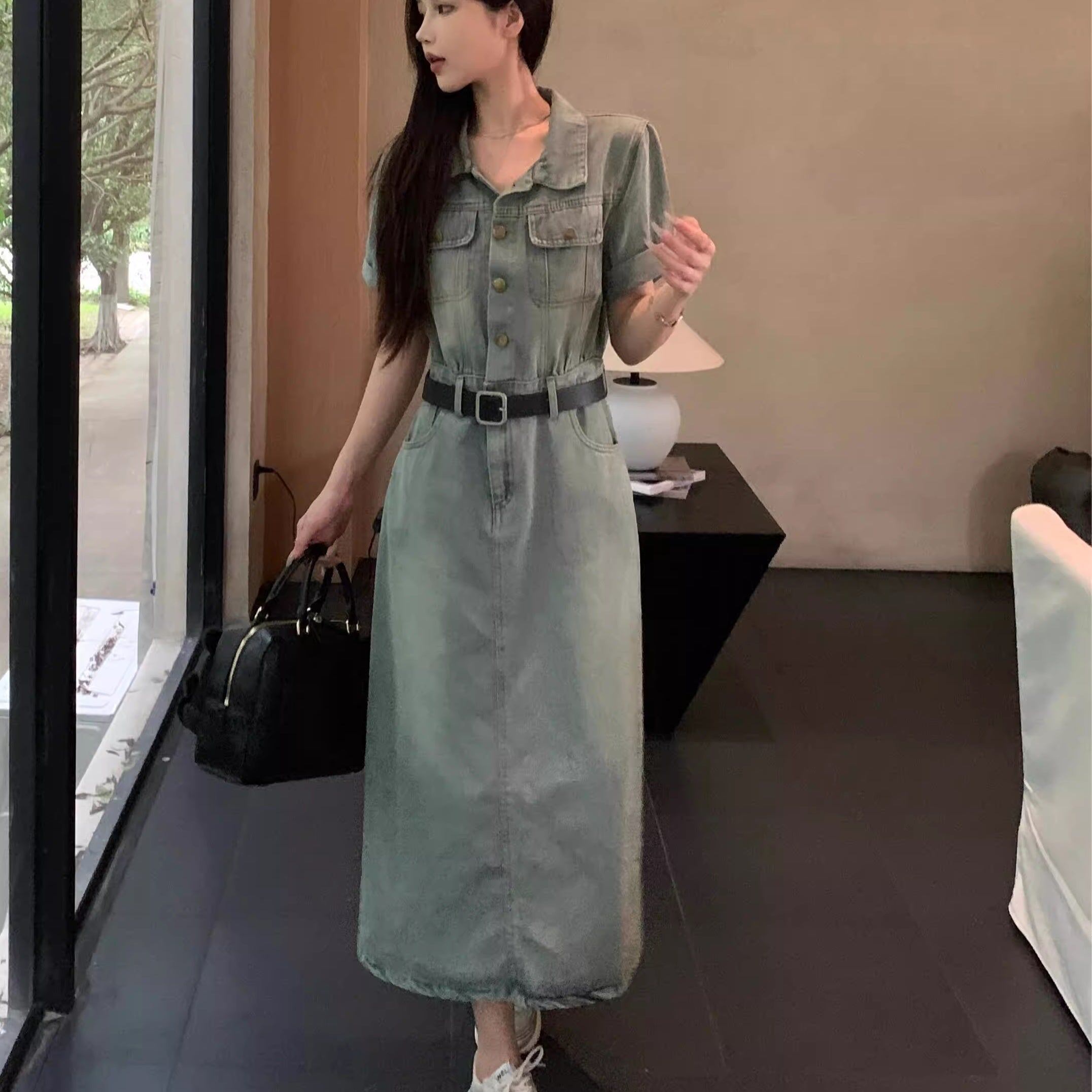 ワンピース デニム ボタン レディース 韓国 ファッション シャツワンピ ダメージ加工 ビンテージ おしゃれ レトロ 夏ワンピ