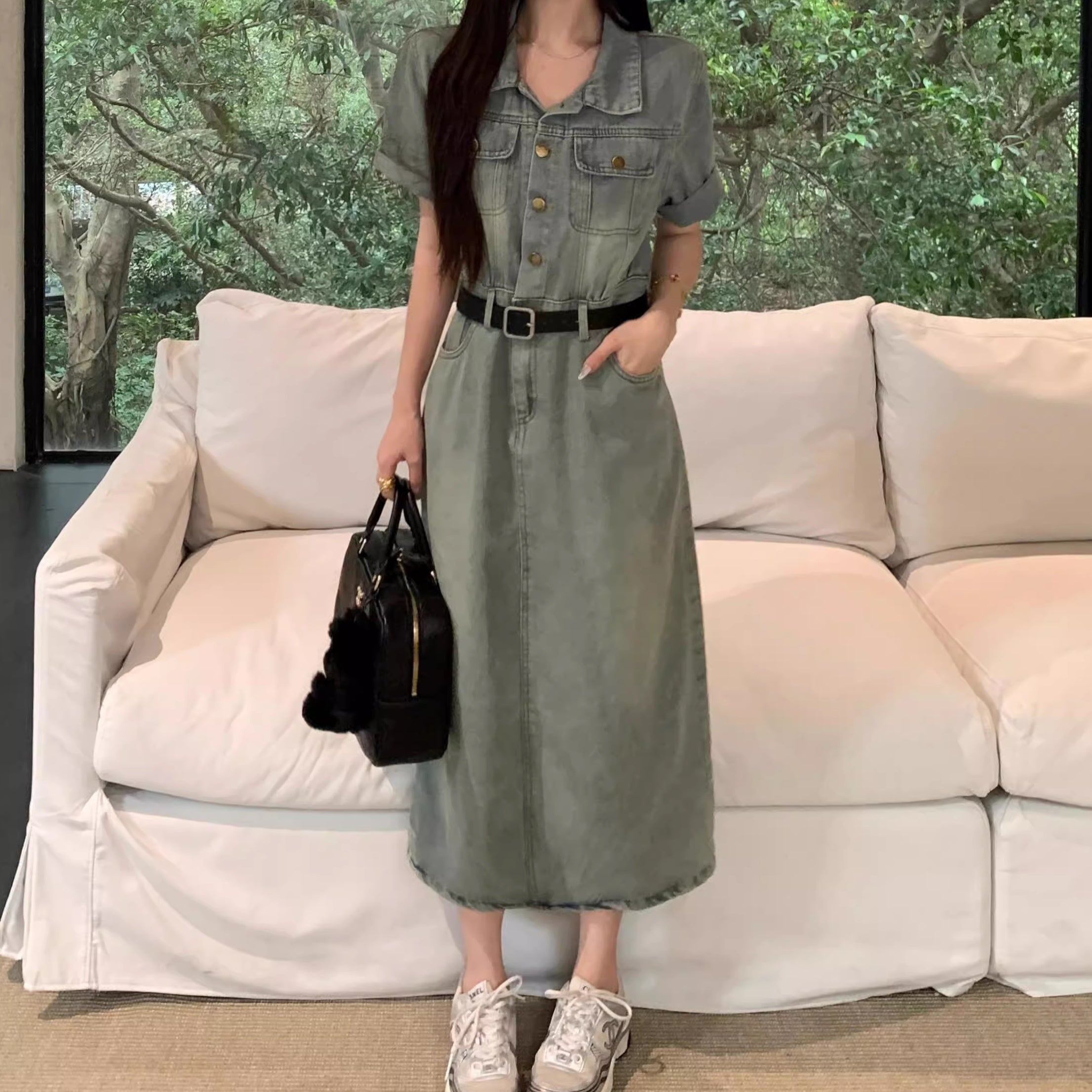 デニム ワンピース 韓国 ファッション ロングワンピ ダメージ加工 ビンテージ レトロ 半袖 夏ワンピ