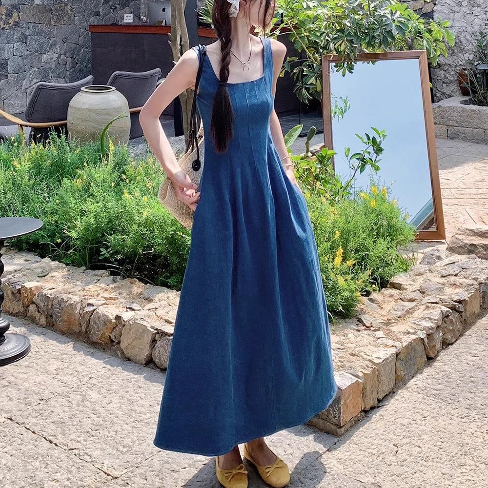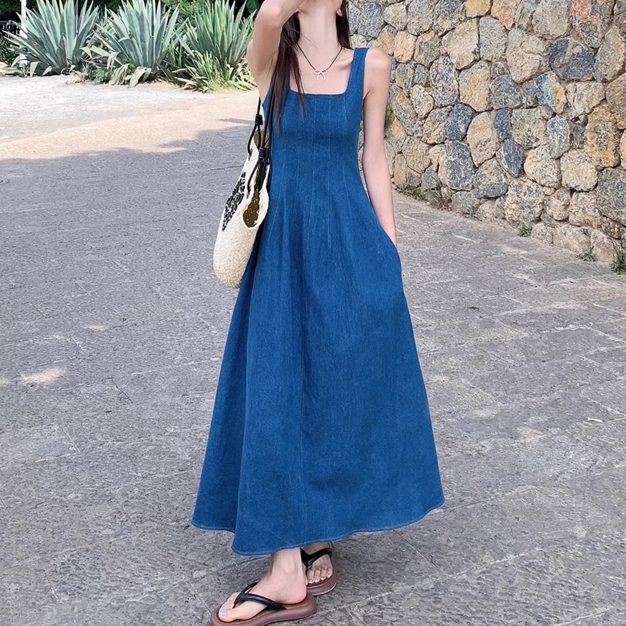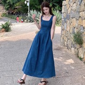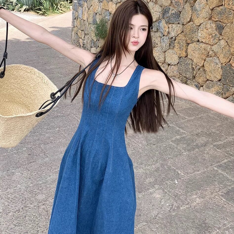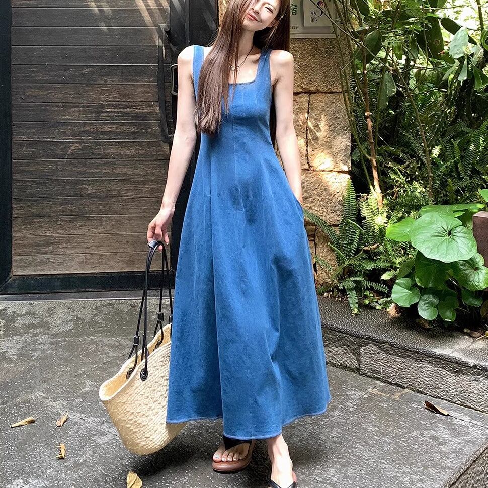 デニム ワンピース 韓国 夏 Aライン フレア ノースリーブ ロングワンピース スクエアネック