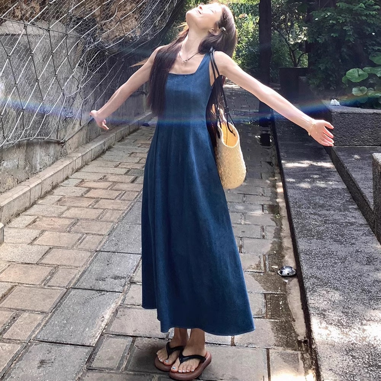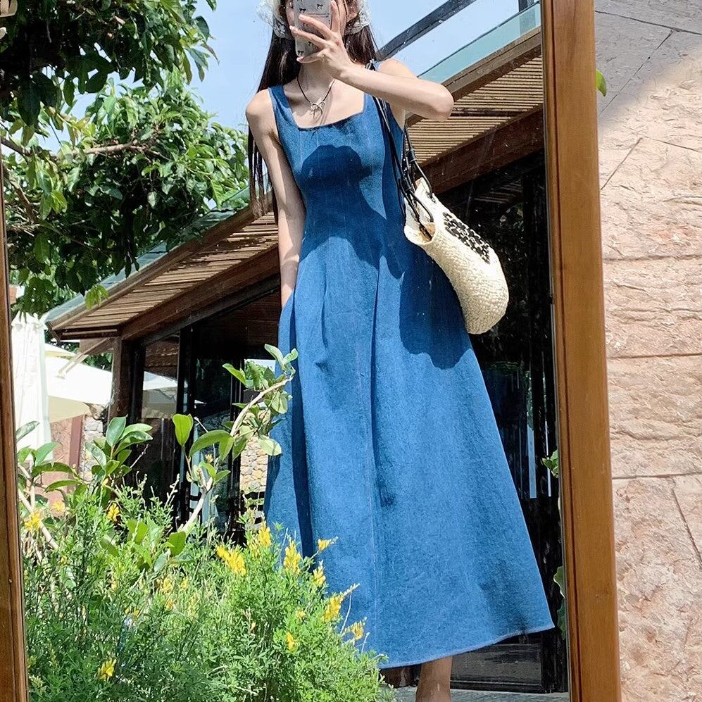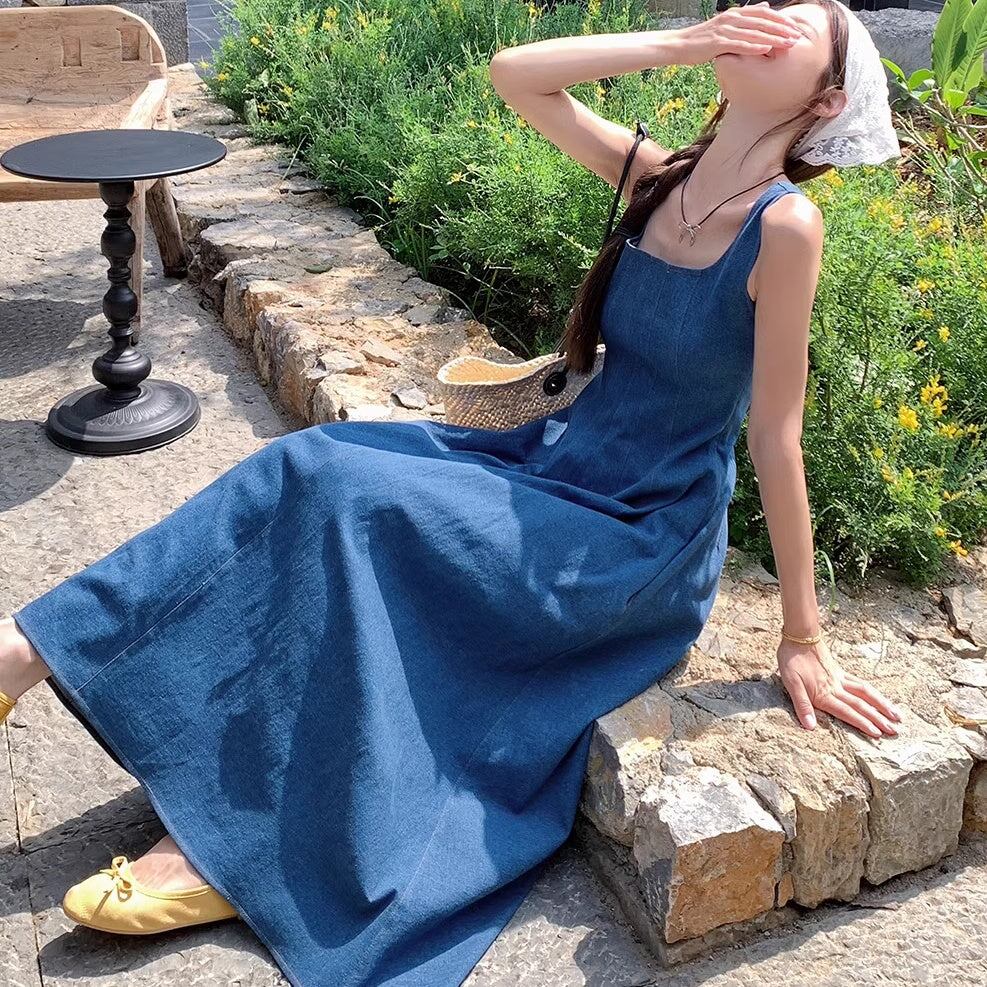 デニム ワンピース 韓国 夏 Aライン フレア ノースリーブ ロングワンピース スクエアネック