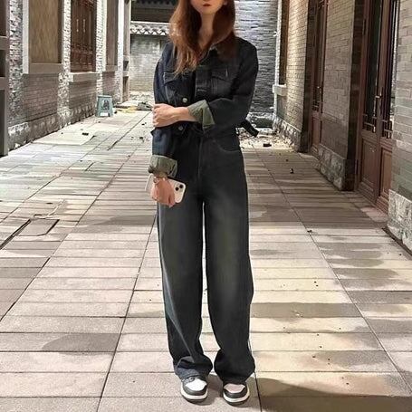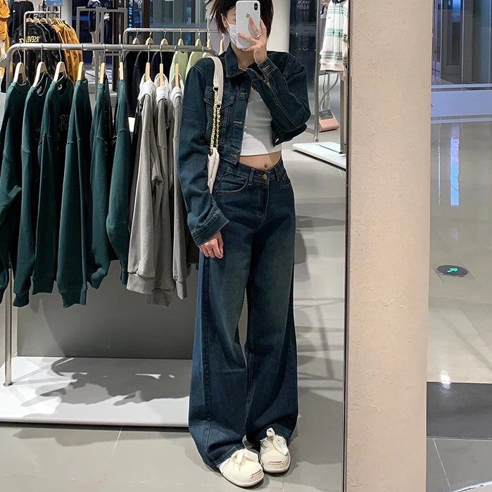デニムセットアップ クロップジャケット レディース 韓国 ファッション インディゴカラー ハイウエストデニムパンツ きれいめデニム 上下セット 2点