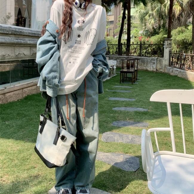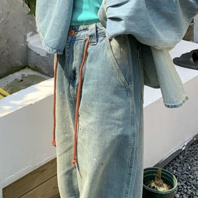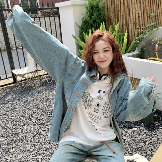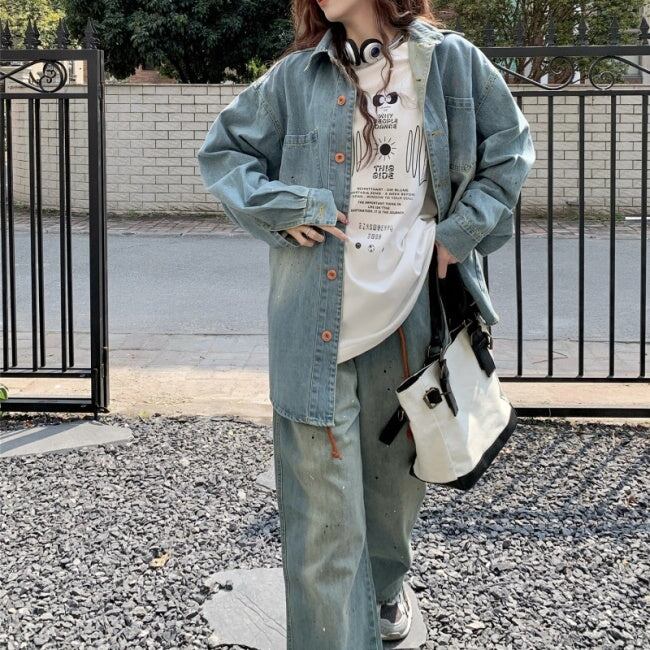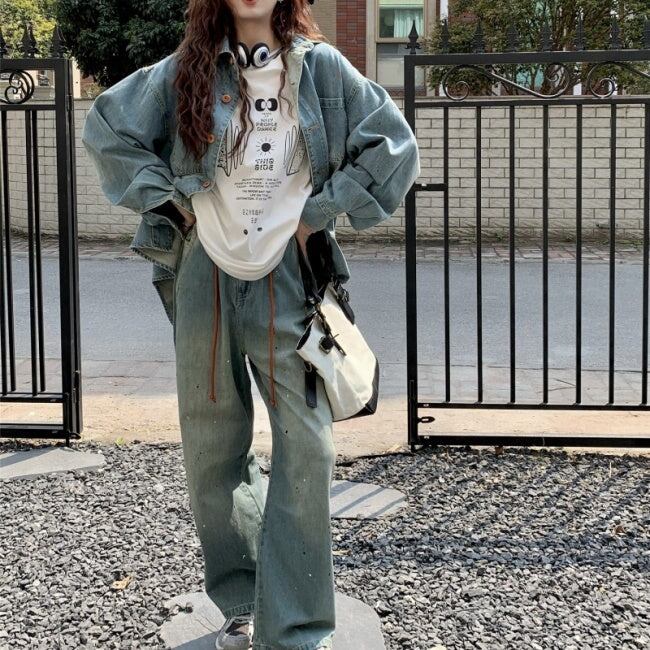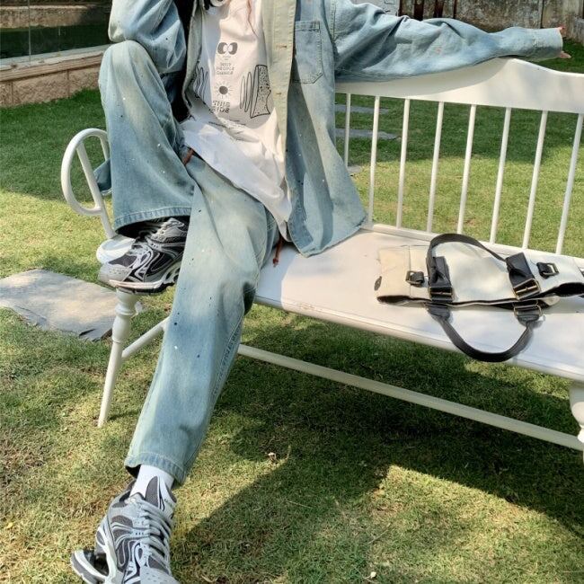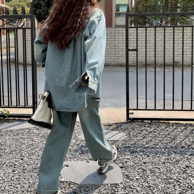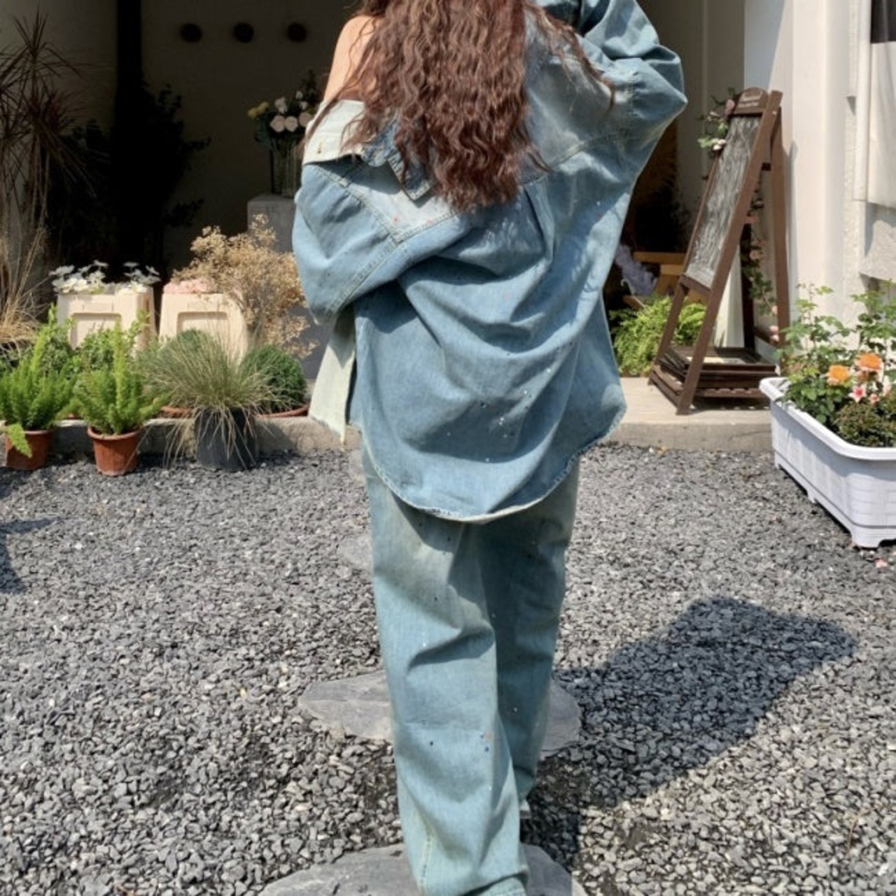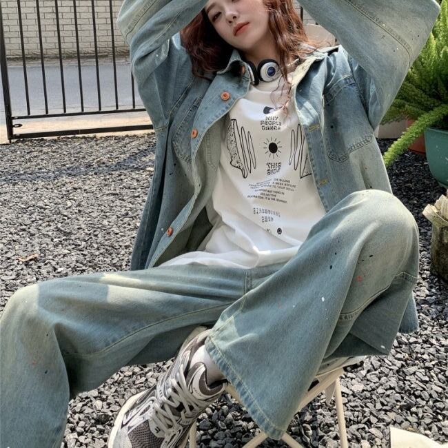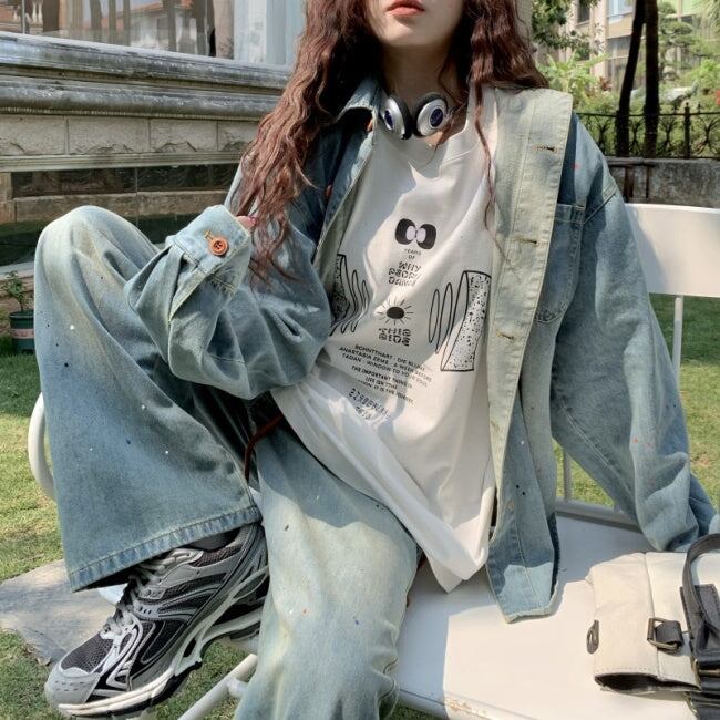 デニムセットアップ デニムパンツ デニムシャツ Tシャツ レディース 韓国 ファッション 半袖Tシャツ ペイント スプラッシュ マルチ ビンテージ デニム