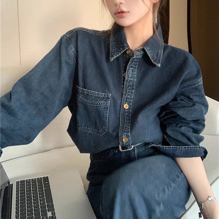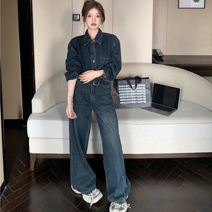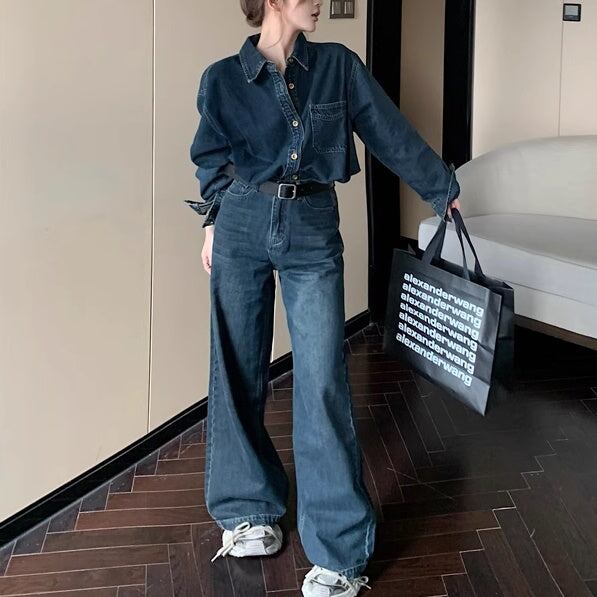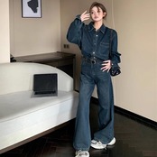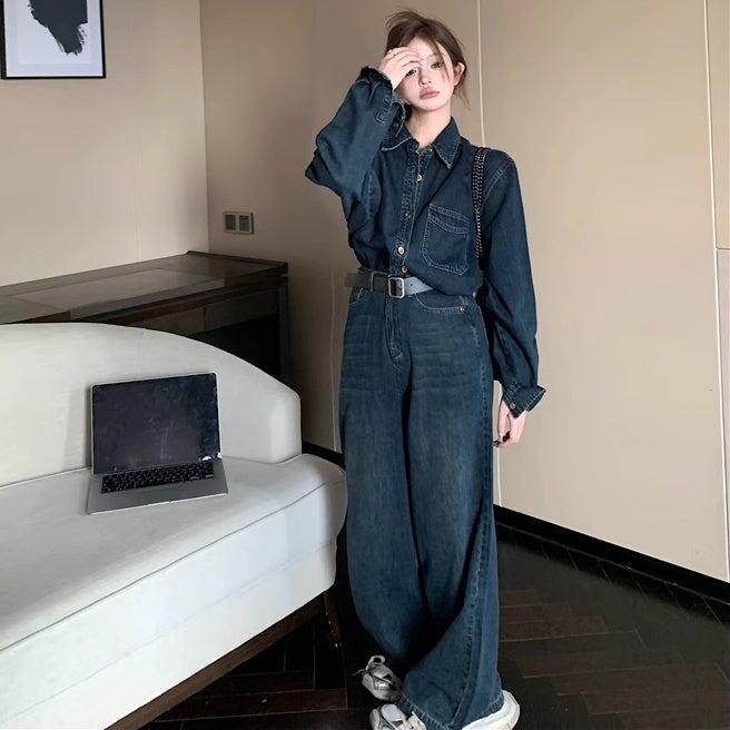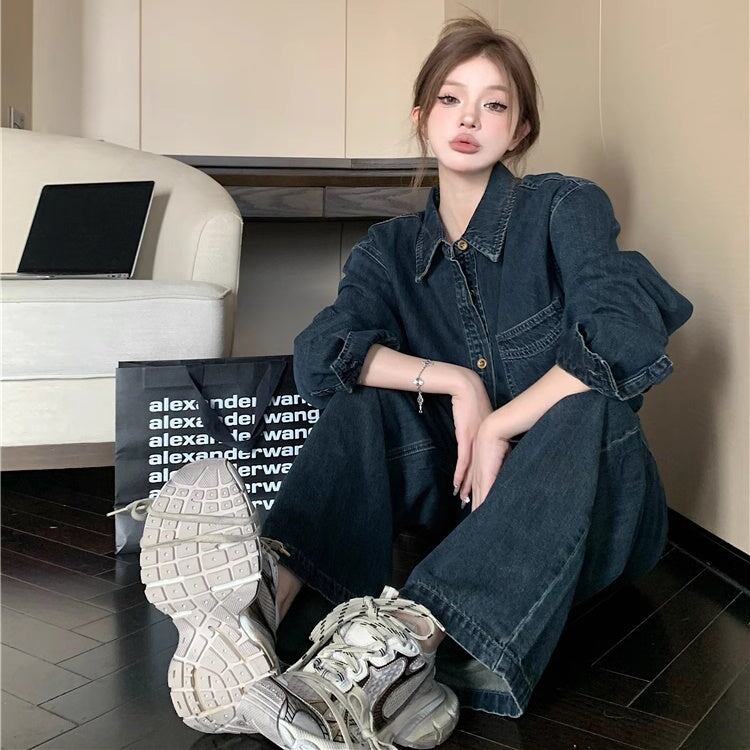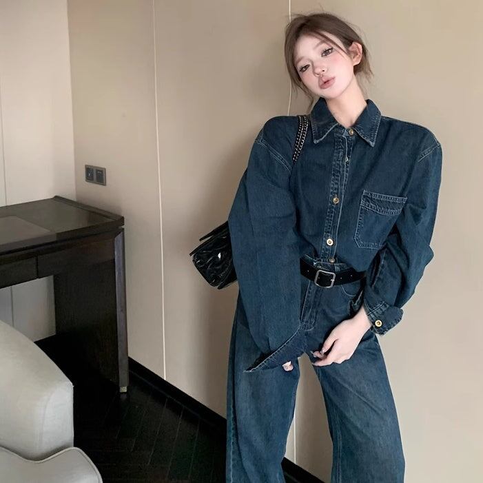 デニムセットアップ レディース 韓国 ファッション ダンガリーシャツ デニムパンツ パッチ デニムオンデニム 2点上下セット