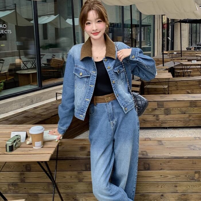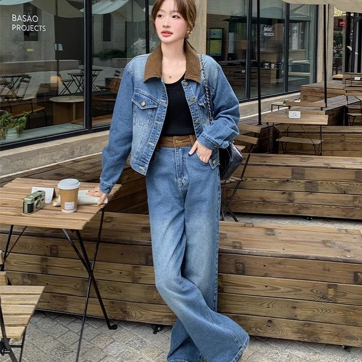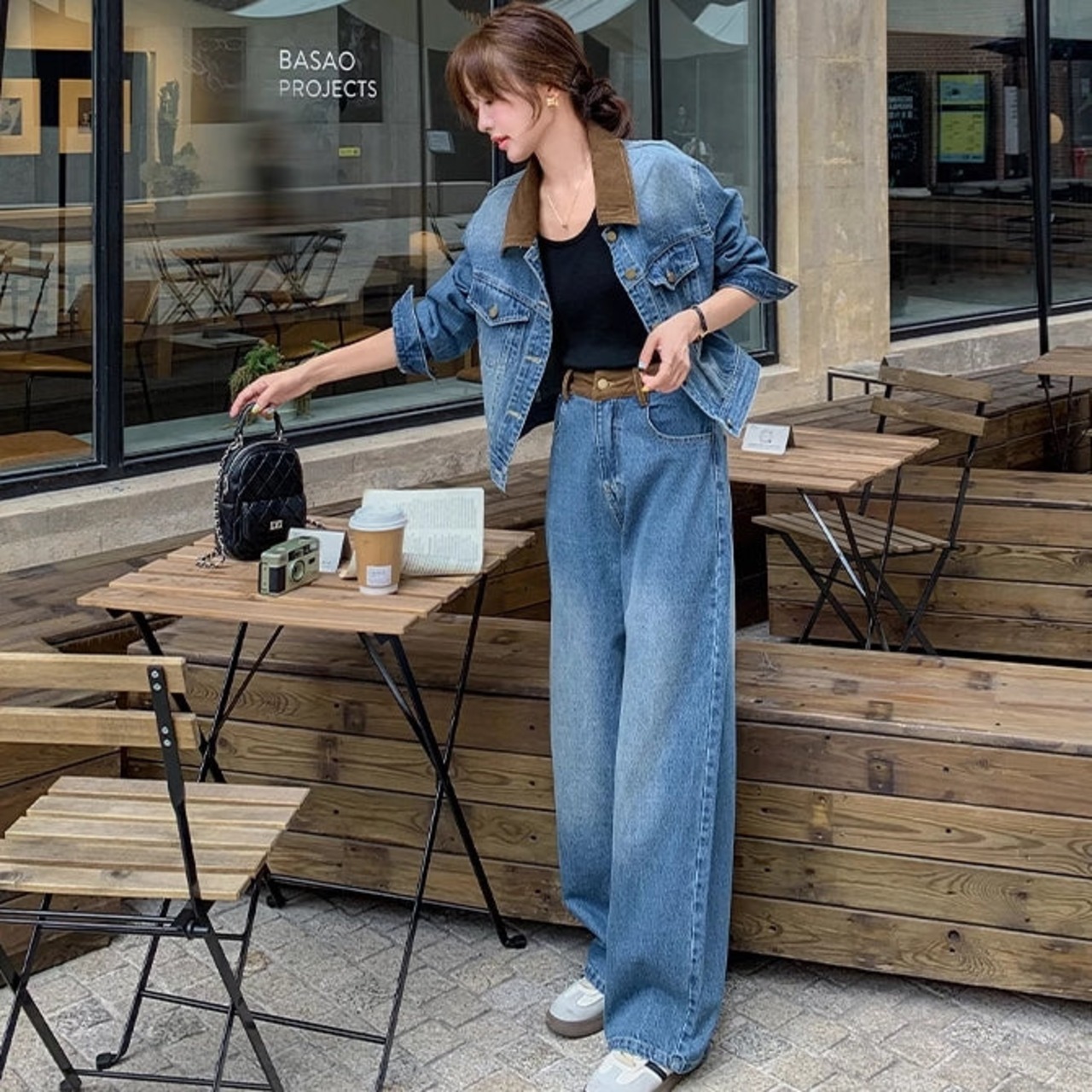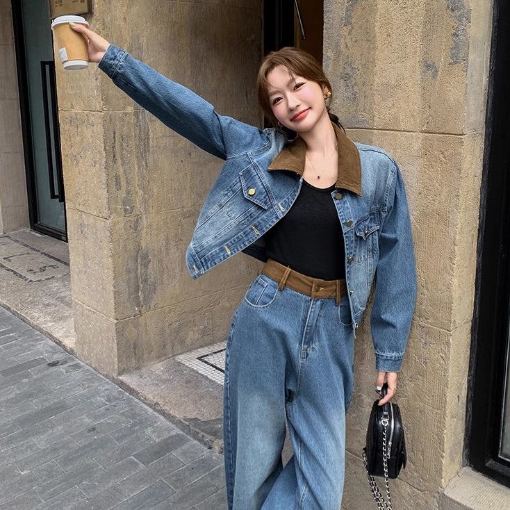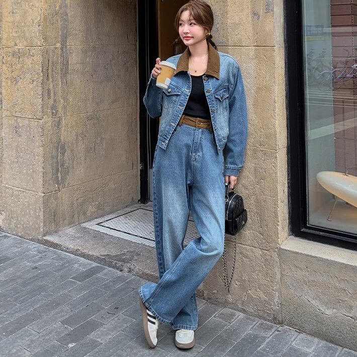 デニムセットアップ レディース 韓国 ファッション 異素材ミックス ソフトデニム ワイドパンツ デニムジャケット バイカラー