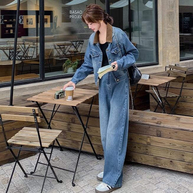 デニムセットアップ レディース 韓国 ファッション デニム ワークジャケット ワイド デニムパンツ 上下セット ヴィンテージ加工