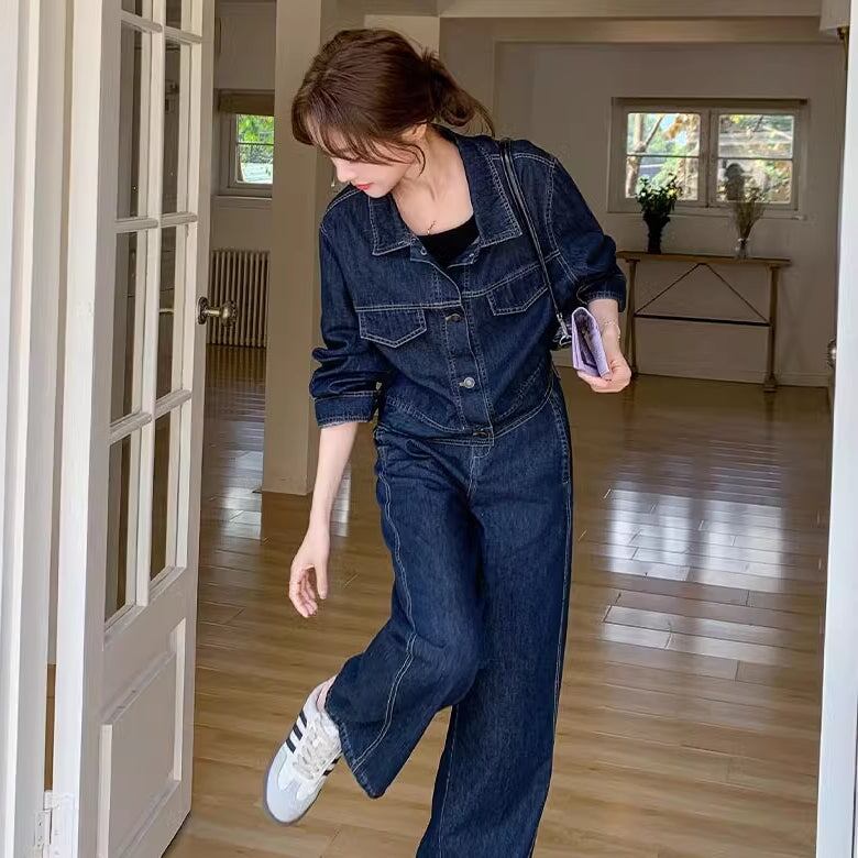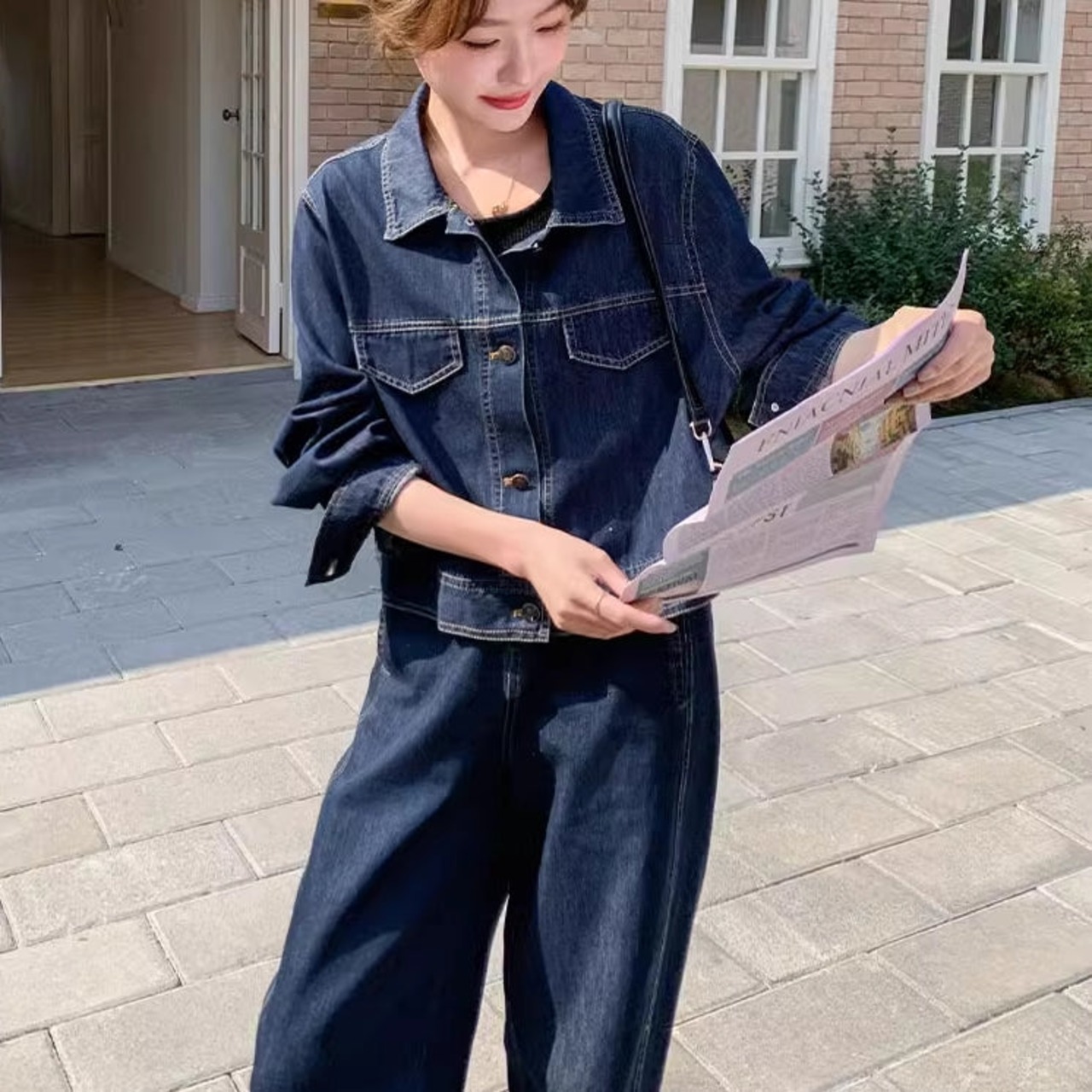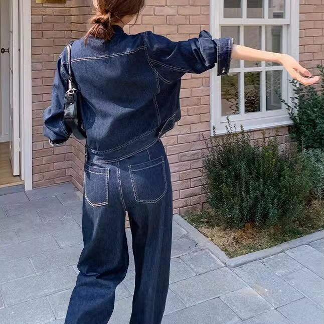 デニムセットアップ レディース 韓国 ファッション デニムジャケット ワイドパンツ ネイビー インディゴデニム 上下2点セット ショート丈ジャケット ブルゾン アウター ロングパンツ