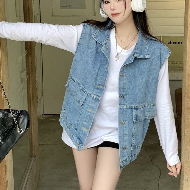デニムベスト ジレ レディース 韓国 ファッション レイヤード ウォッシュドデニム オーバーサイズ 重ね着 春夏