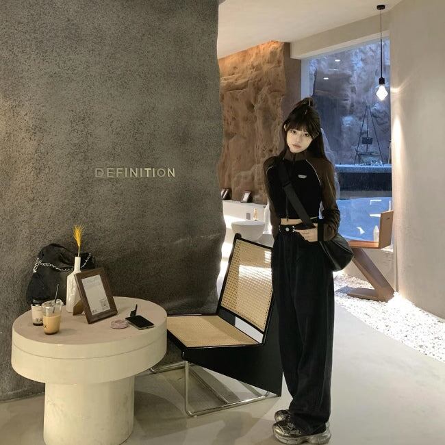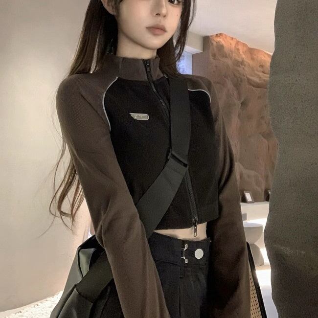 クロップトップ スポーティ レディース 韓国 ファッション ハーフジップ バイカラー ショート丈 ロゴ ダブルジップ クロップトップ ブルゾン 長袖