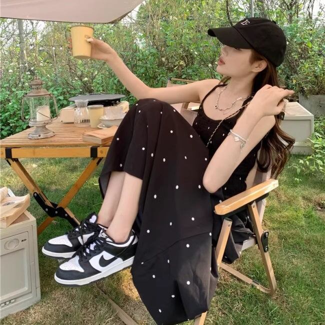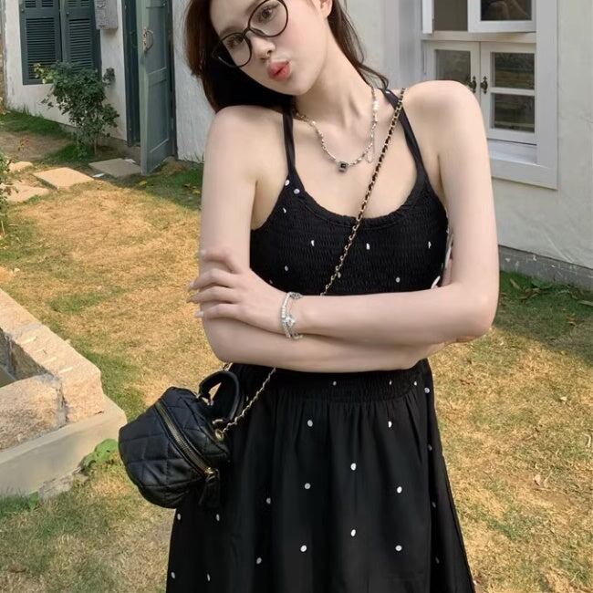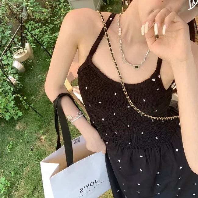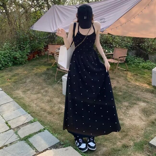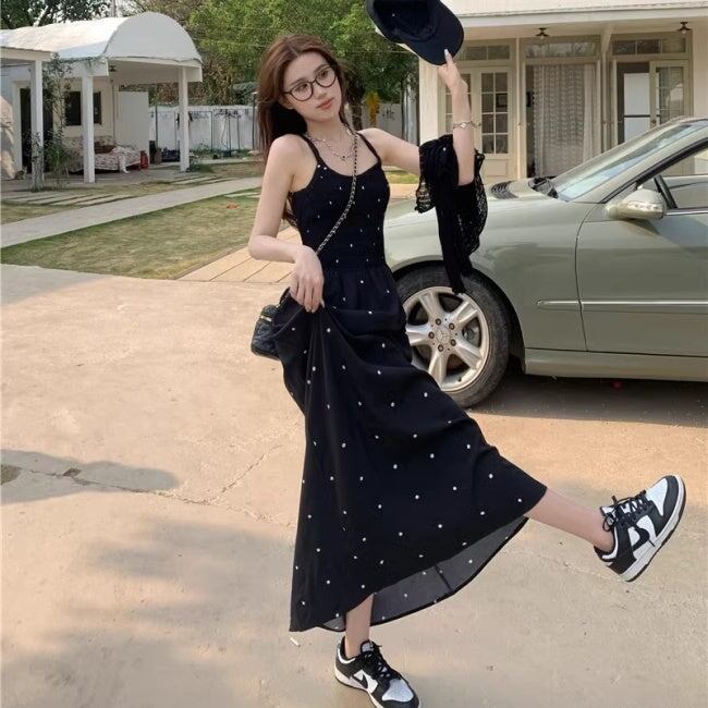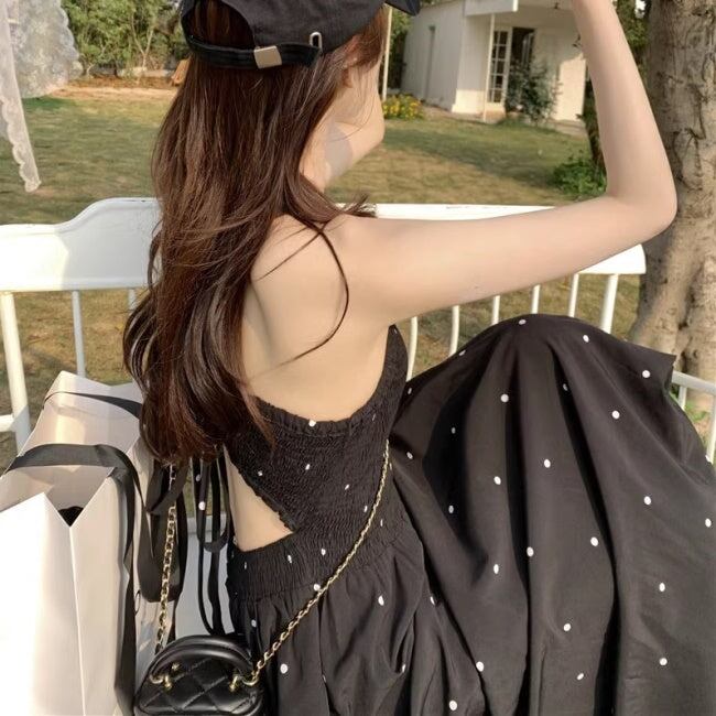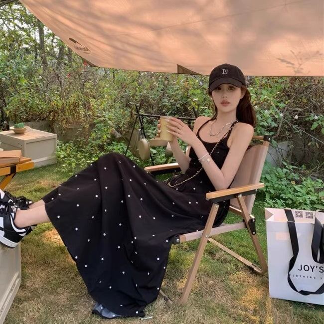 ドット キャミ ロングワンピース 韓国 ファッション バックホール 背中見せ Aラインフレア サマーワンピ 夏