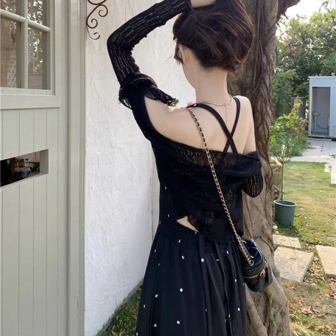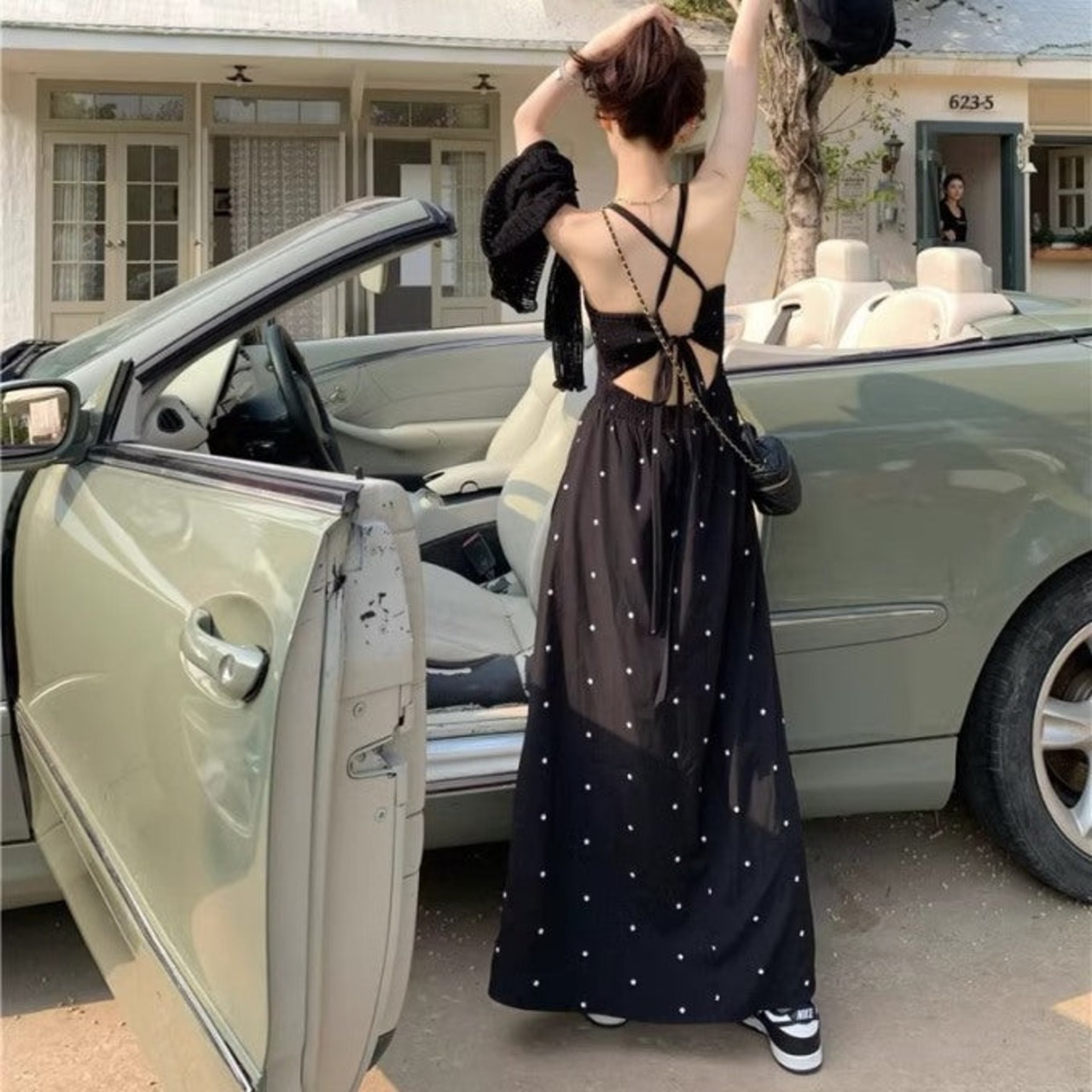 ドット ワンピース カットアウト バックシャン 韓国 ファッション フレア ロングワンピース 夏