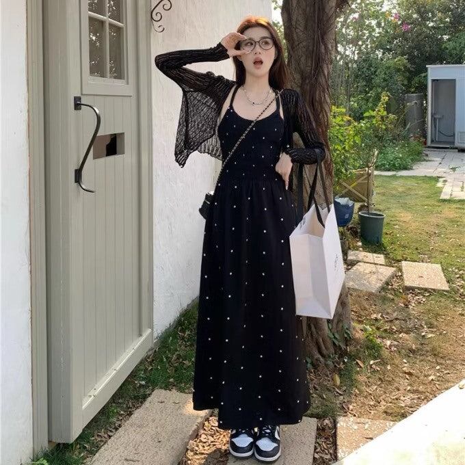 ドット柄 ワンピース レディース 韓国 ファッション Aライン ロングフレア マキシ ブラックワンピース