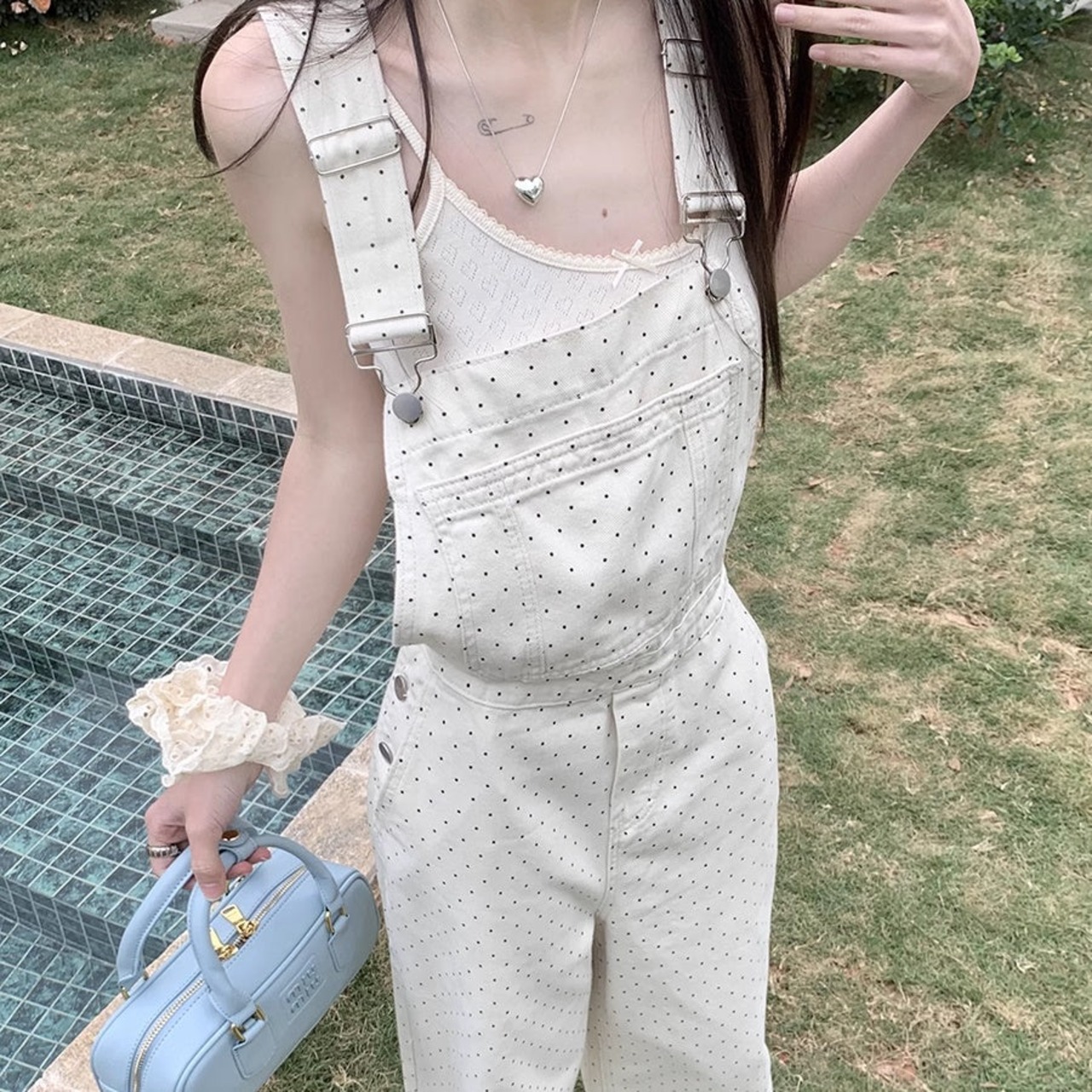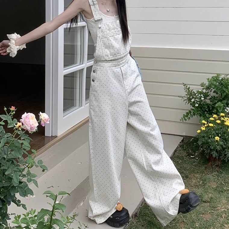 オーバーオール レディース 韓国 ファッション ドット 水玉 白パンツ かわいい ジャンプスーツ ワイドパンツ