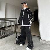 ジャージ セットアップ レディース 韓国 ファッション 上下2点セット 黒ジャージ サイドライン 細ライン ジョガーパンツ トラックトップ ブルゾン ジャケット シンプル 体系カバー