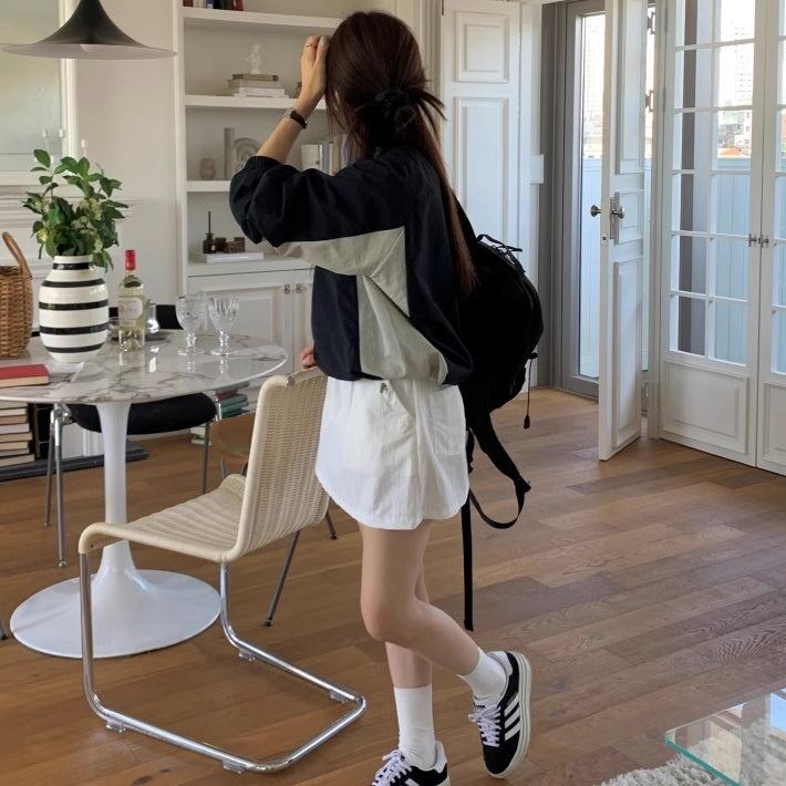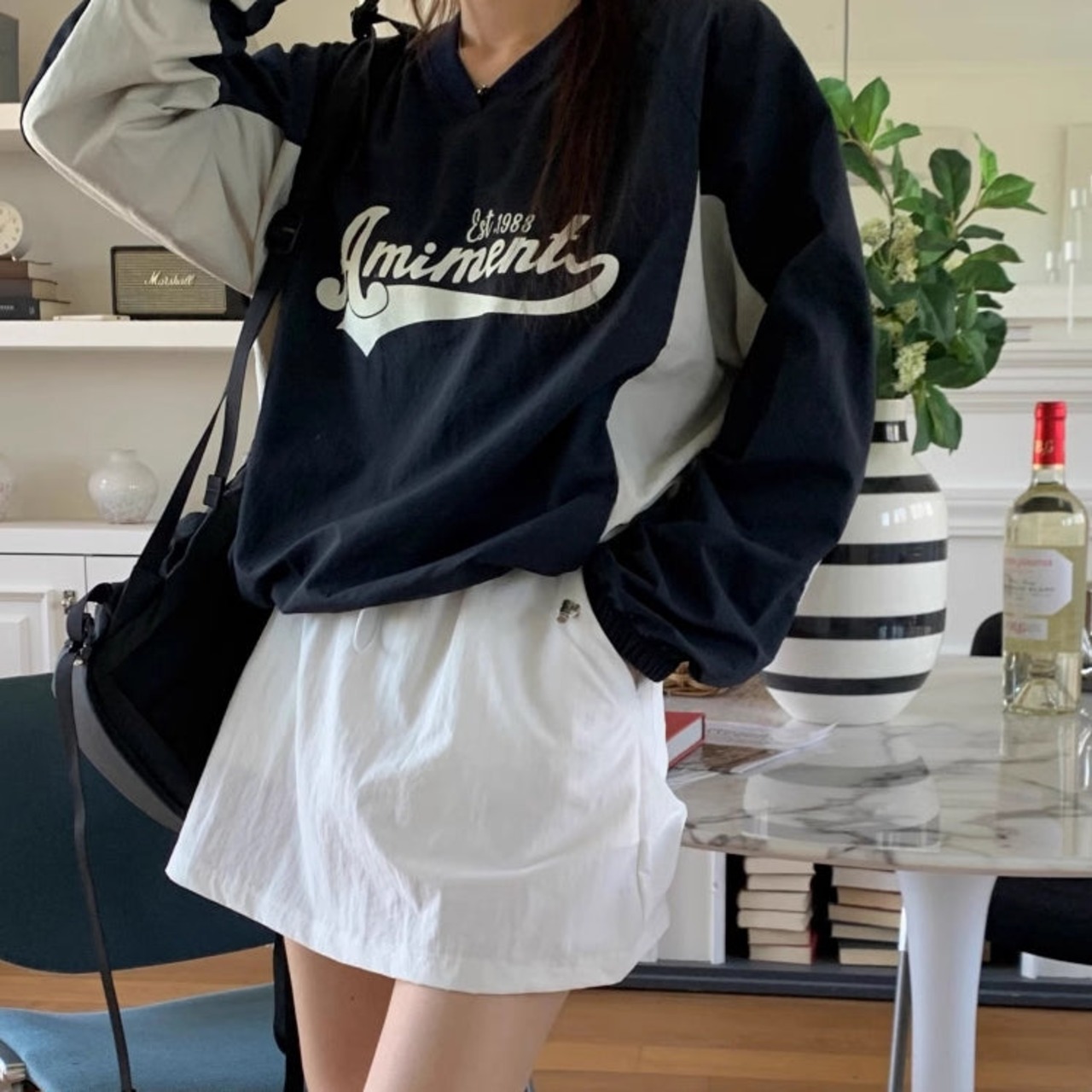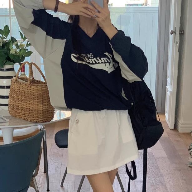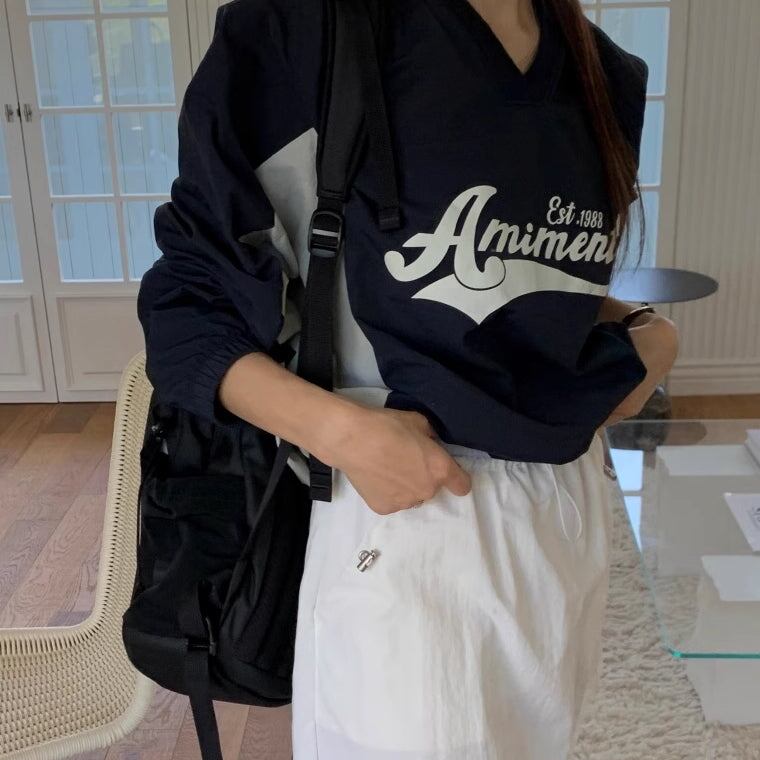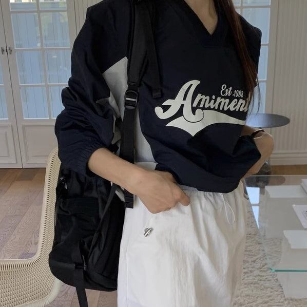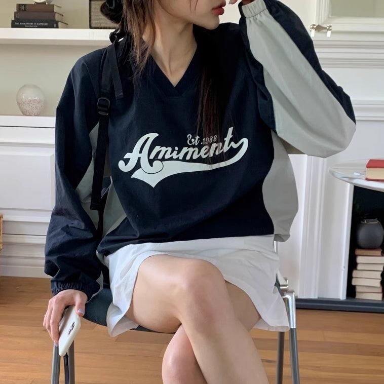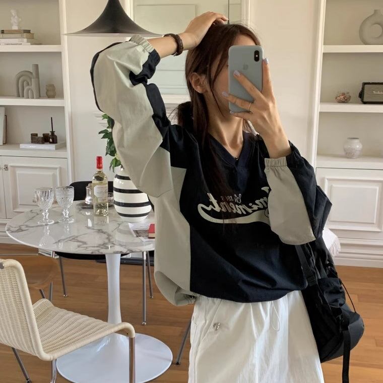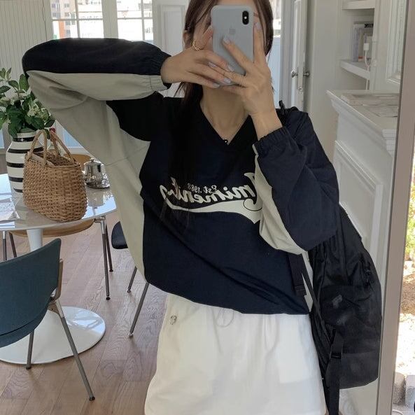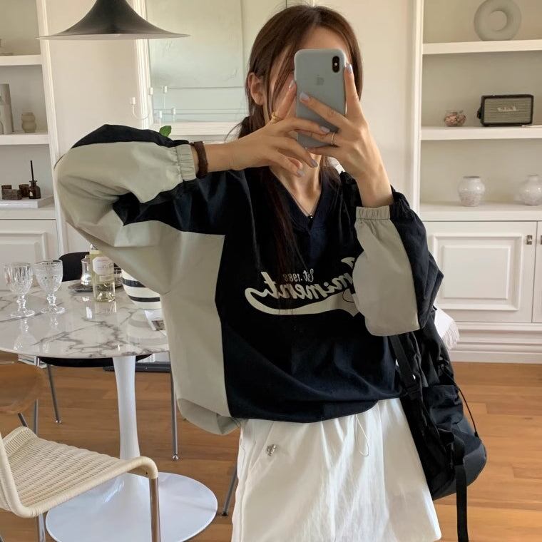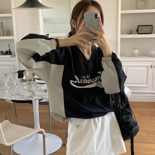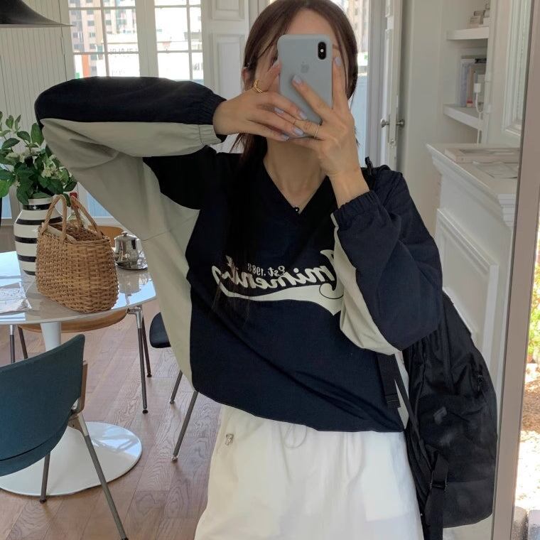 ナイロン スウェット トレーナー レディース 韓国 トップス バイカラー ロゴプリント Vネック オーバーサイズ プルオーバー