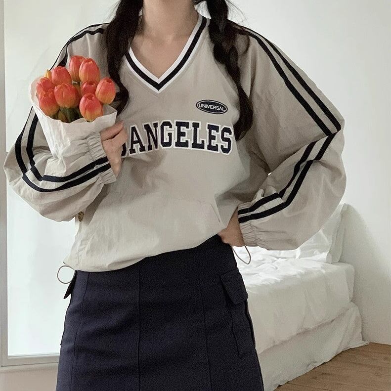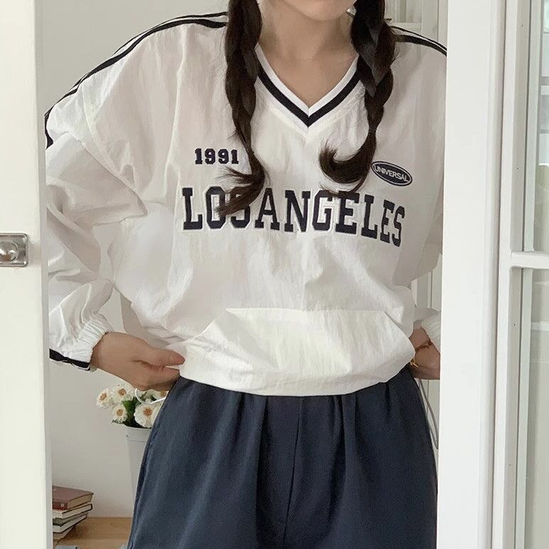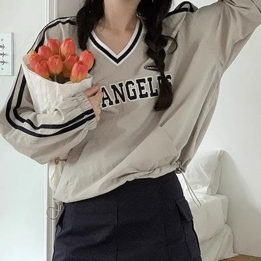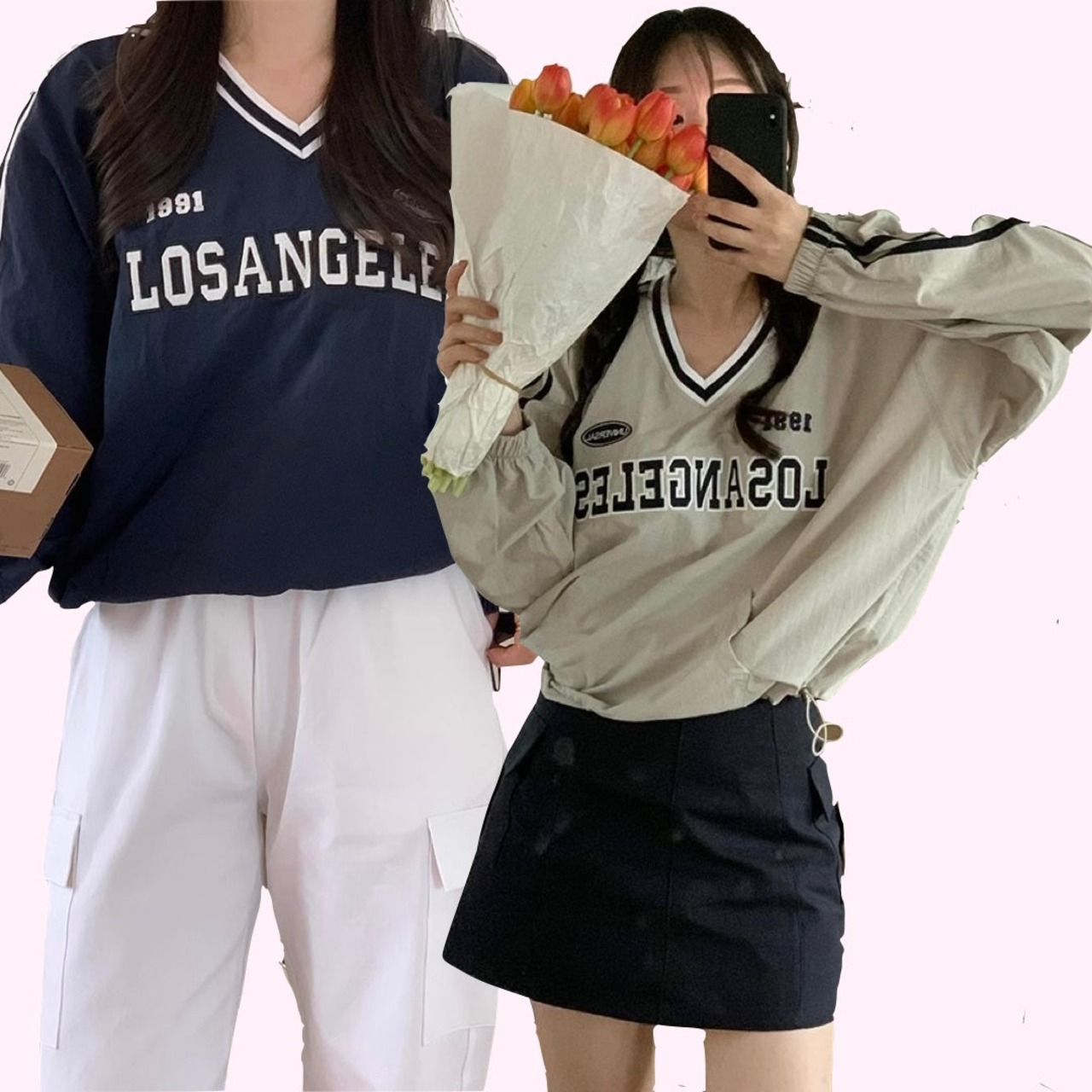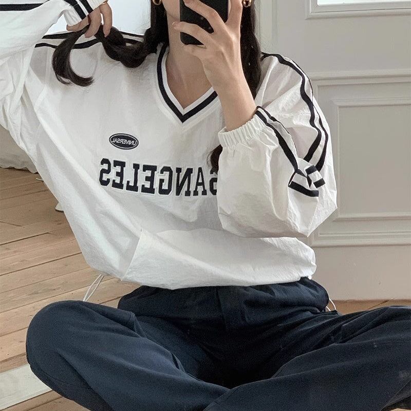 ナイロン トレーナー レディース 韓国 ファッション Vネックライン スポーティ オーバーサイズ ドローコード トップス