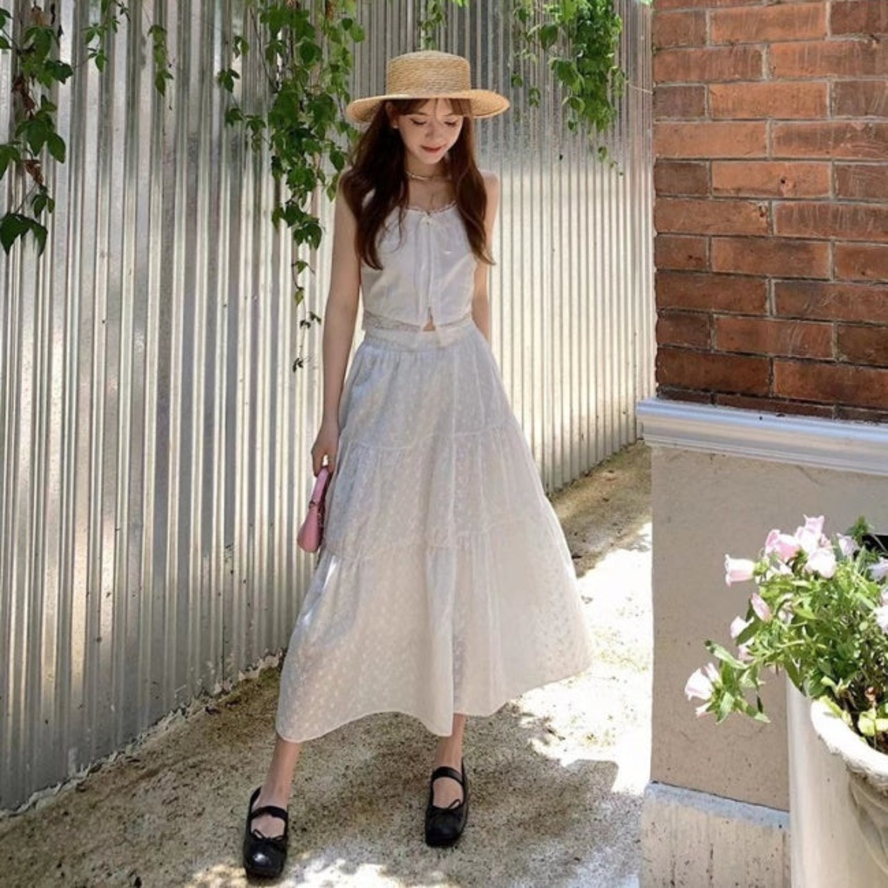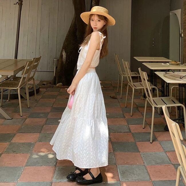 夏セットアップ ロングスカート レディース 韓国 ファッション ノースリーブ 白コーデ クロップドトップス ロングマキシ Aラインフレア