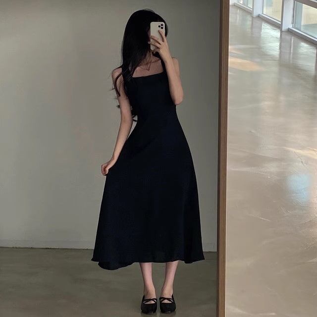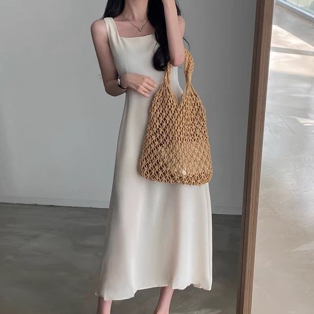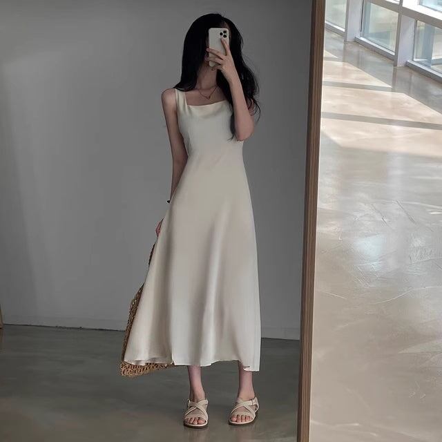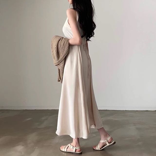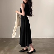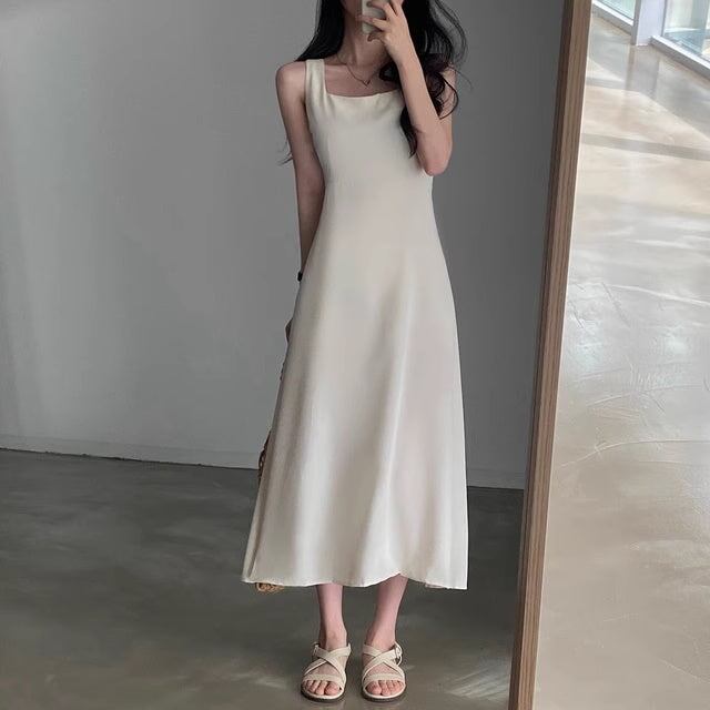 ノースリーブ ロングワンピース 韓国 ファッション バックリボン スクエアネック お呼ばれ 夏ワンピース デコルテ Aライン