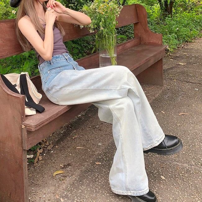 ハードウォッシュ デニム ワイドパンツ レディース 韓国 ジーンズ デニム モップパンツ グラデーション ルーズフィット パンツ